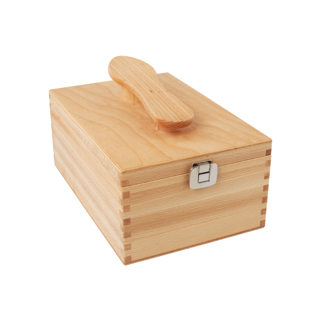 Kassen er opdelt i to rummelige sektioner, hvor du kan opbevare børster, pudsemidler og andet tilbehør. Du kan f.eks. burge kasse til Skopudsesættet med skes børster fra Bürstenhaus Redecker.