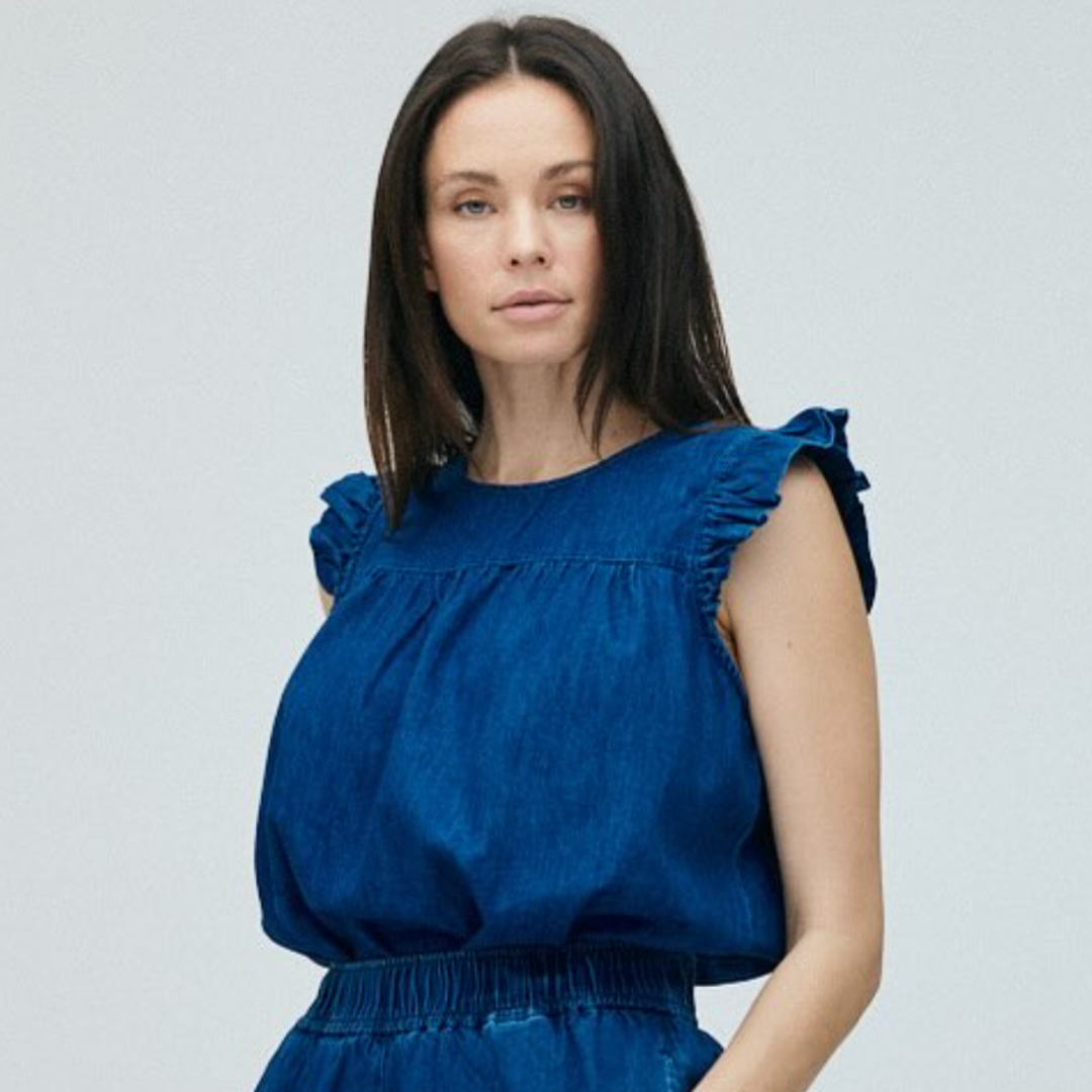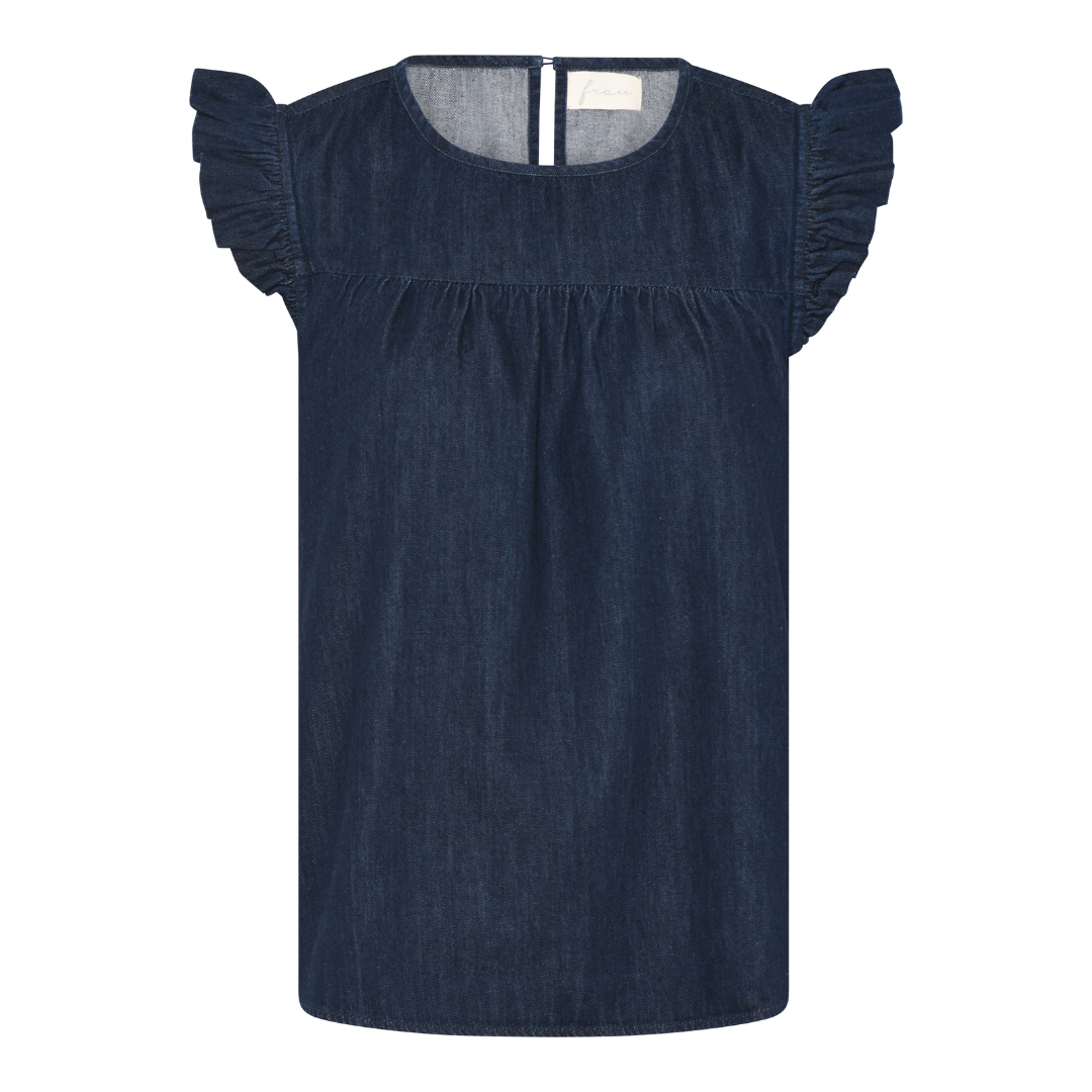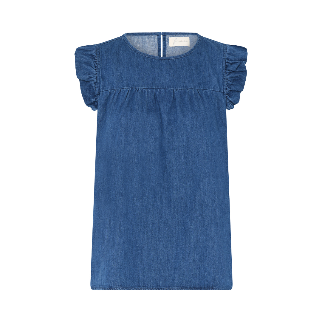 Stockholm toppen fra Frau, er en ærmeløs top i blød denim med fine flæser på skuldrene og let rynk foran, som giver et feminint og afslappet udtryk. Den runde halsudskæring lukkes med en lille knap i nakken.