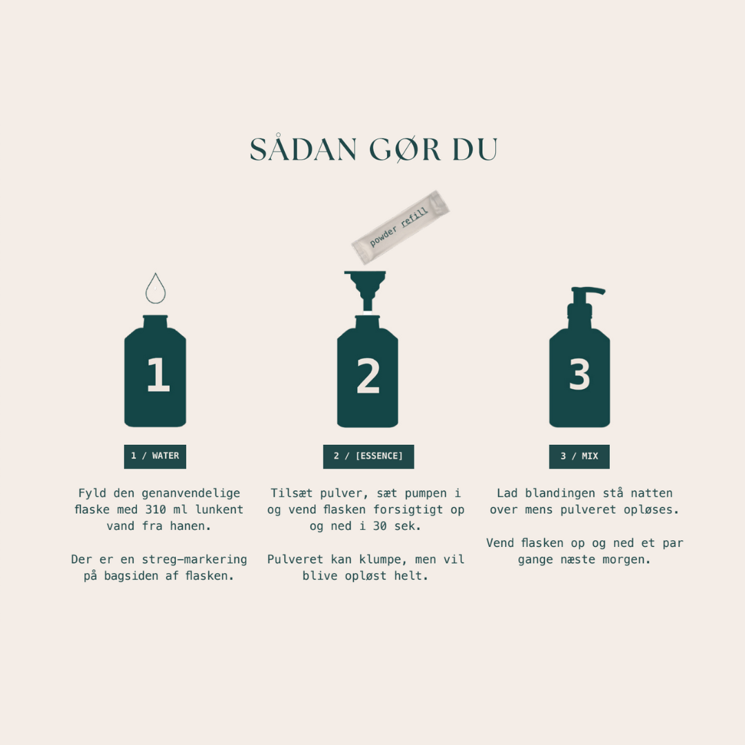 De tre poser håndsæbe-pulver (refills) giver 3 x 340 ml færdigblandet håndsæbe.