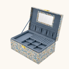 Det store skrin er betrukket med et smukt Liberty-blomsterprint og har et luksuriøst fór, spejl i låget og praktiske rum til både ringe, halskæder og armbånd. Det indvendige fór passer smukt til smykkeskrinets ydre.