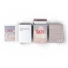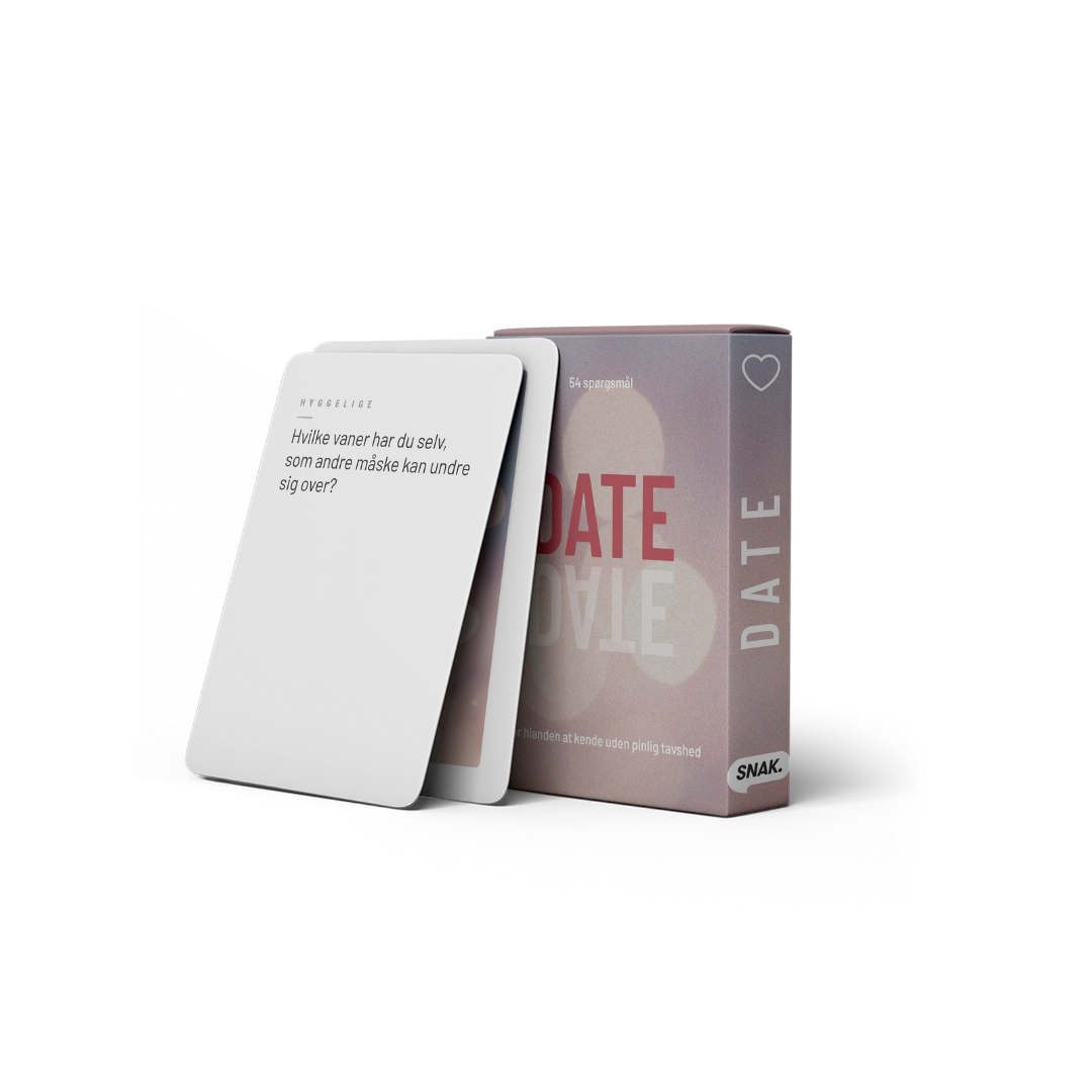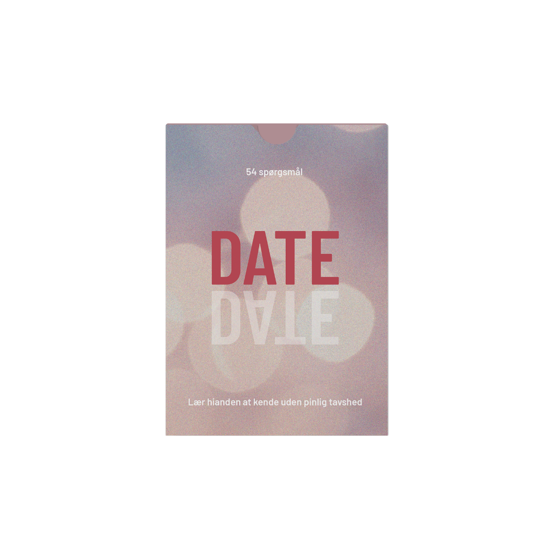 DATE er et sæt samtalekort til at få den gode samtale godt i gang fra start. På den måde kan i lære hinanden at kende uden pinlig tavshed og sammen undersøge om der er nogen gnist. Stil hinanden spørgsmål som: Hvornår sang du sidst for dig selv? Hvad gjorde dig glad som barn? Hvad sætter du mest pris på at være i et forhold?