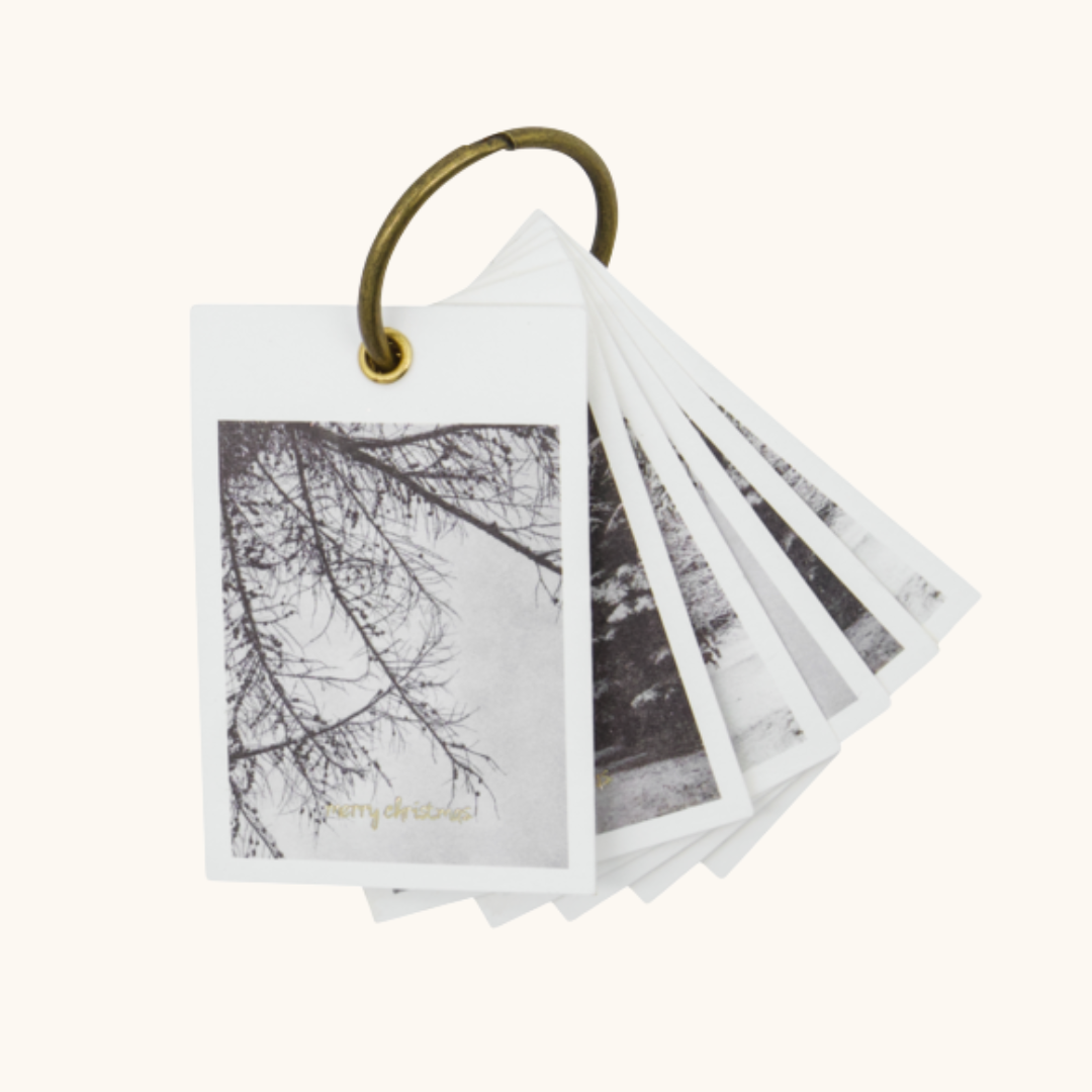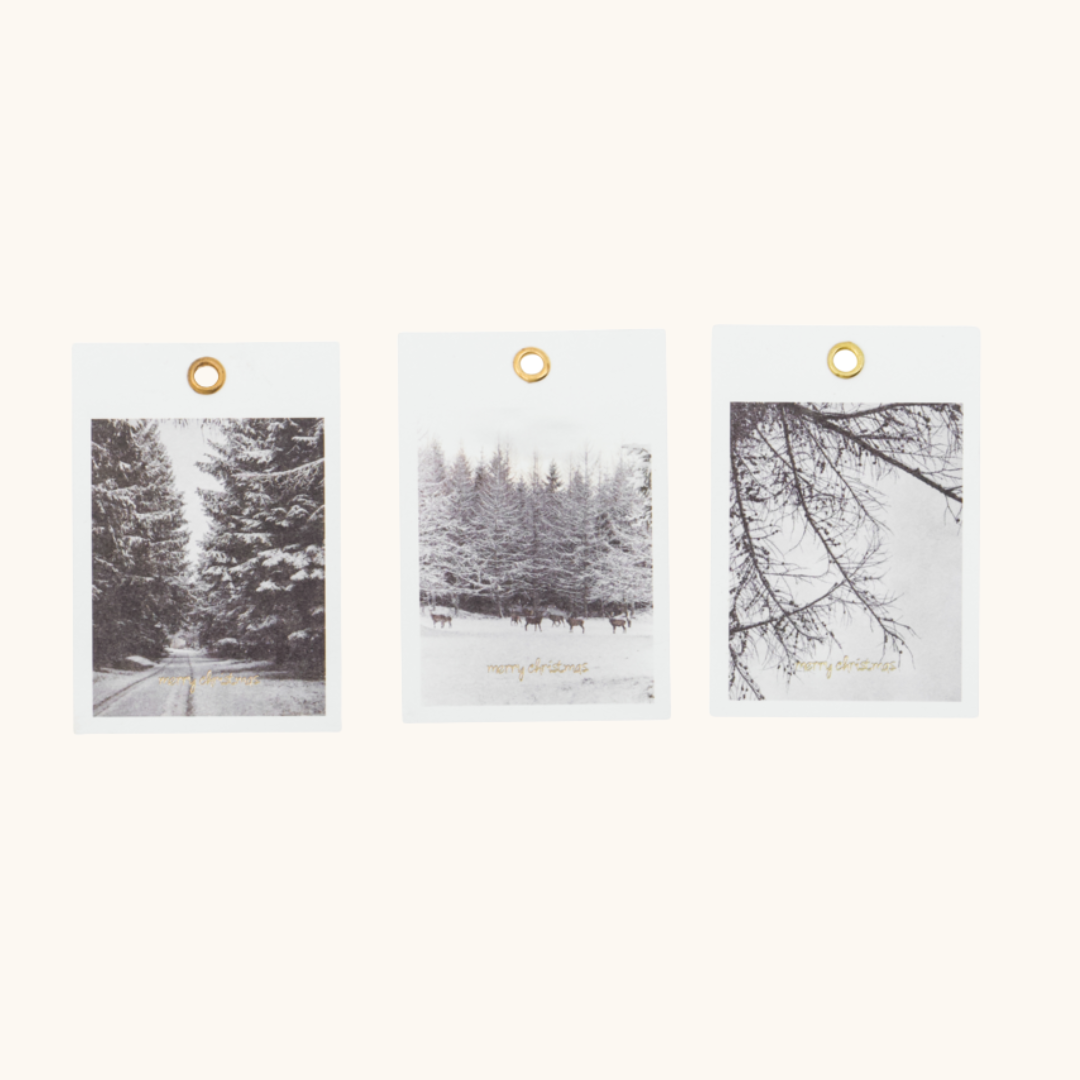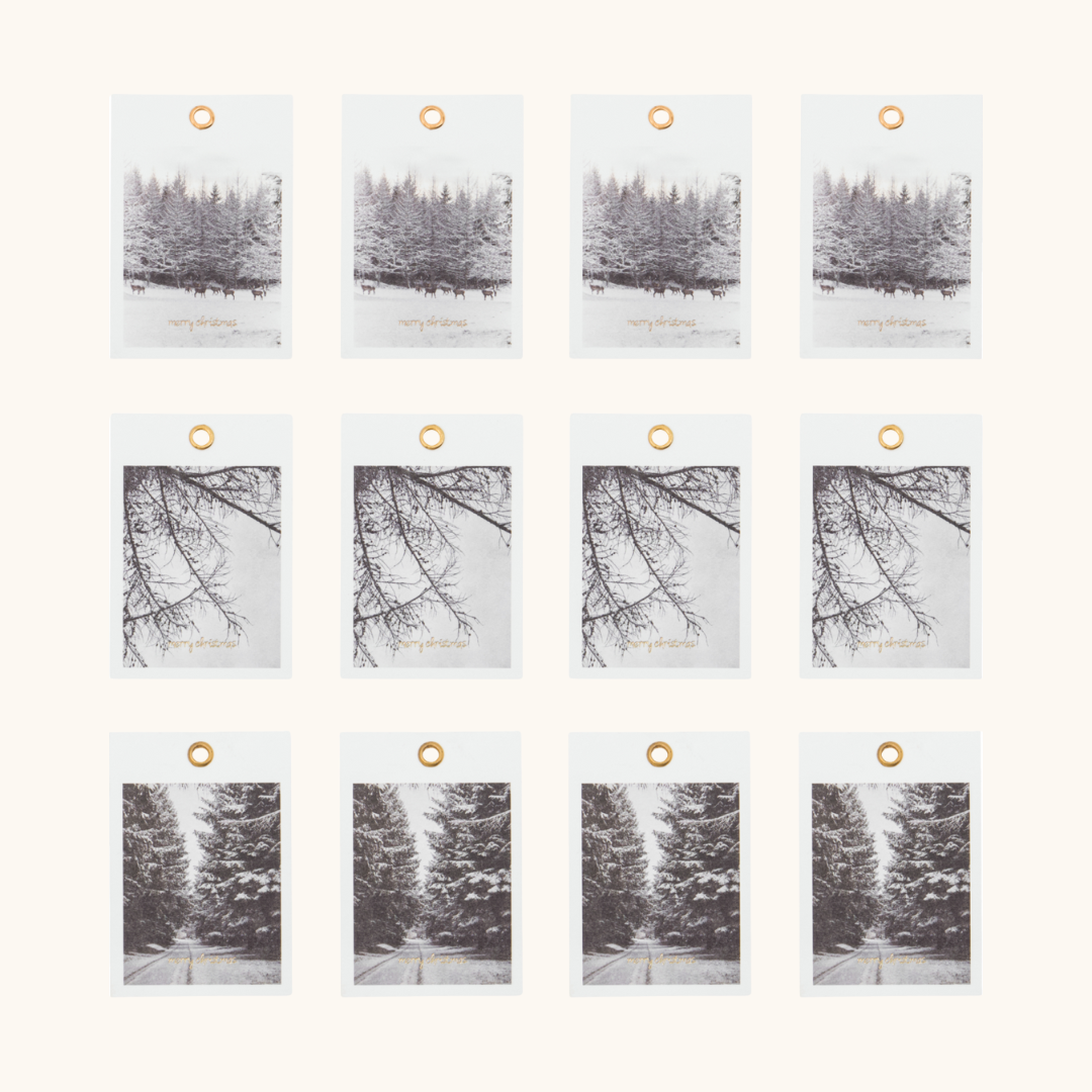 Sættet består af 12 til og fra kort i tre vinterlige designs, hver med et stemningsfuldt motiv og elegant tekst i gyldent glimmer. Kortene har en dekorativ metalring og er nemme at fastgøre på et gavebånd – perfekt til at sætte det sidste personlige præg på dine pakker.