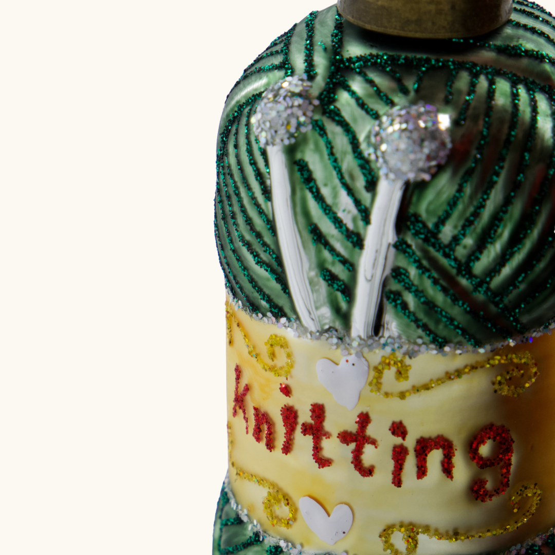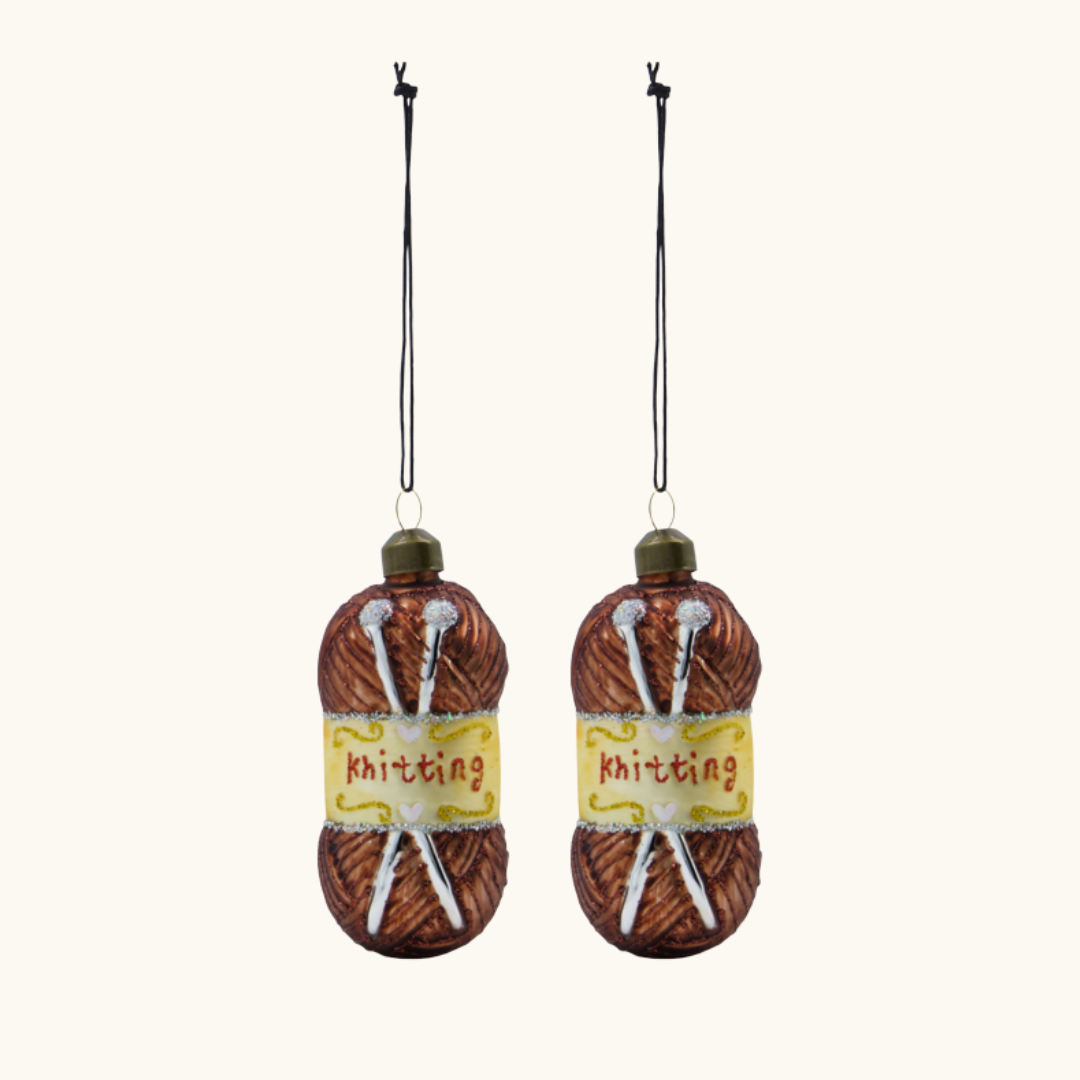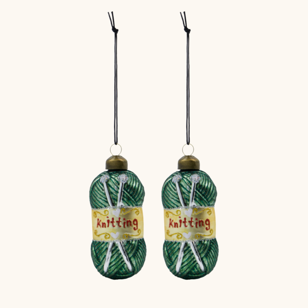 Sættet består af to mundblæste glasornamenter formet som garnnøgler med strikkepinde.
