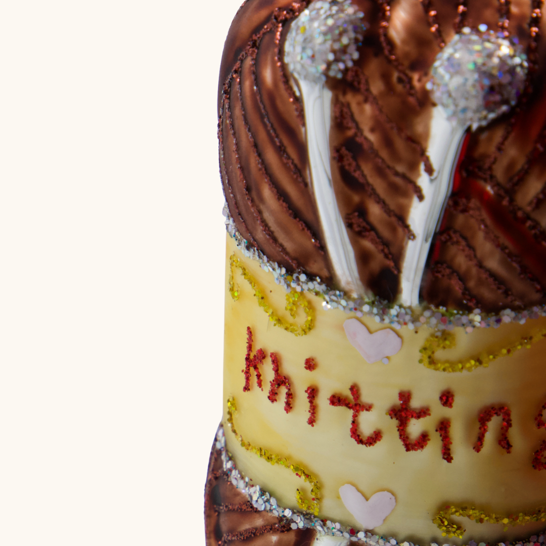 Den fine glimmerdekoration og de varme farver bringer både humor og personlighed til juletræet – en oplagt gaveidé til strikkeentusiasten.