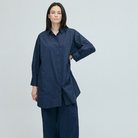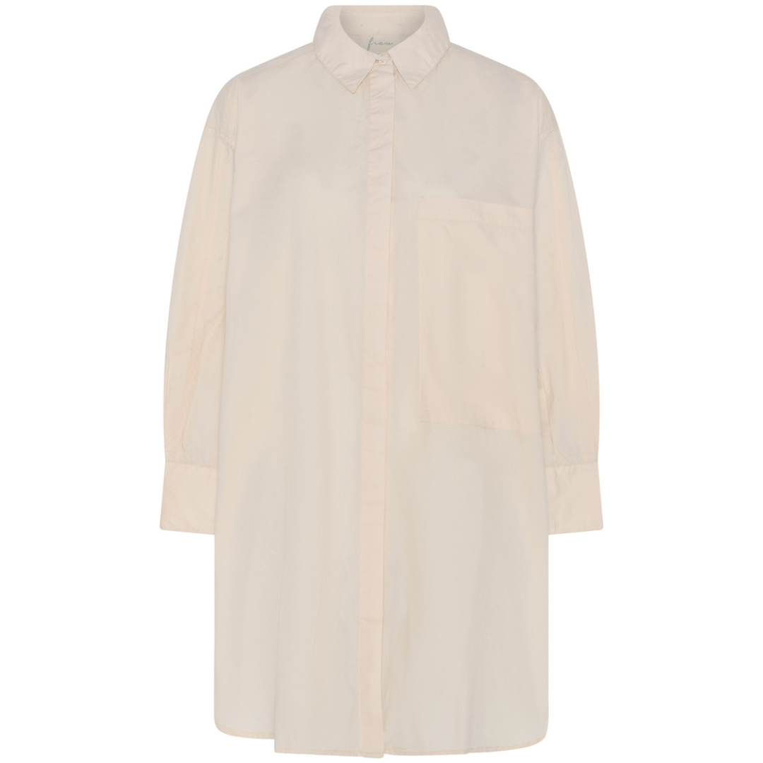 Den er lang i modellen, har lange ærmer, krave, skjult stolpelukning og en slids i siden. Den store brystlomme foran giver skjorten et afslappet og stilrent look.