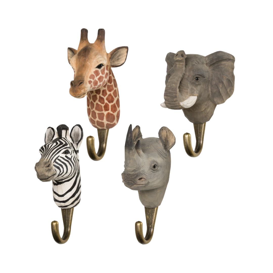 Dekorative knager med giraf, elefant, zebra eller næsehorn.