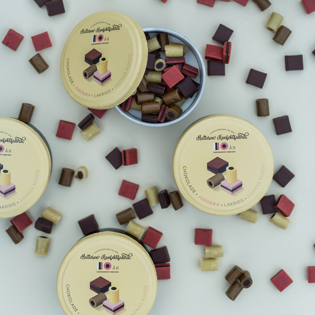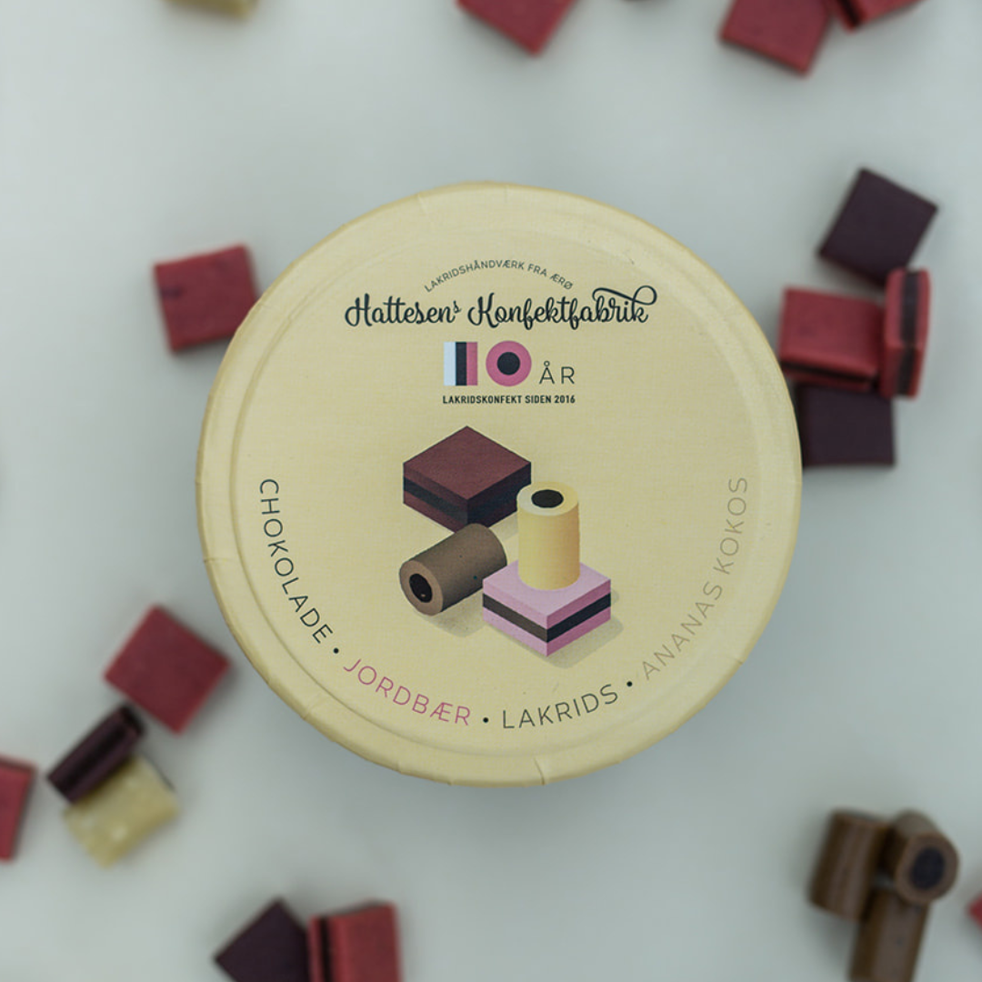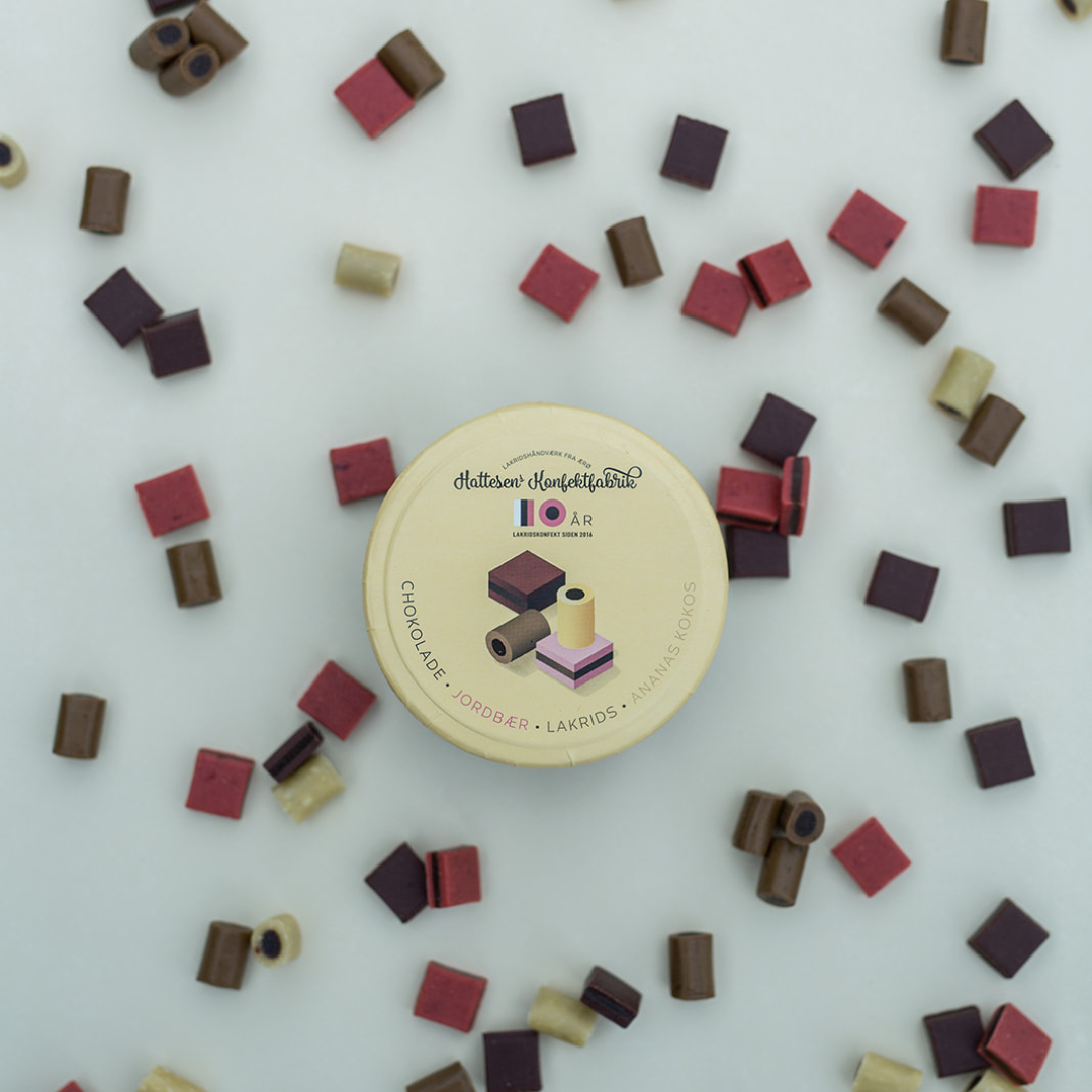 Denne jubilæumsæske fra Hattesens Konfektfabrik er lavet som limited edition til konfektfabrikkens 10 års fødselsdag. Æsken er fyldt med lakridskonfekt i smagene chokolade, lakrids, ananas/kokos og jordbær – alle fire klassikere samlet i små, firkantede stykker.