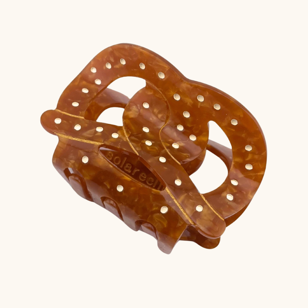 Kringlernes runde, snoede form giver klemmen et skulpturelt udtryk som ser ud som om du har gjort dig umage – selvom den tog tre sekunder at sætte i. Brug den til en løs knold i nakken, halvt op sat, eller til at samle håret i en hurtig og alligevel gennemtænkt frisure.
