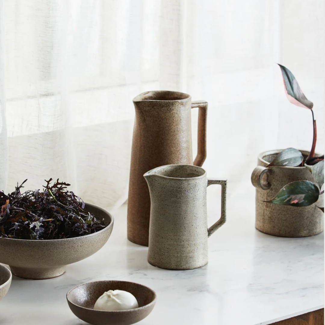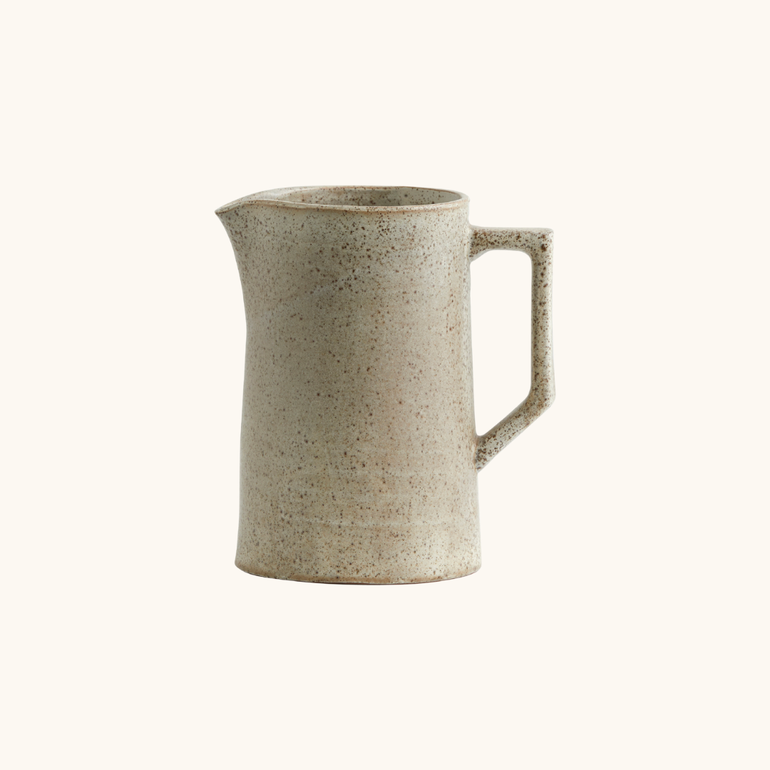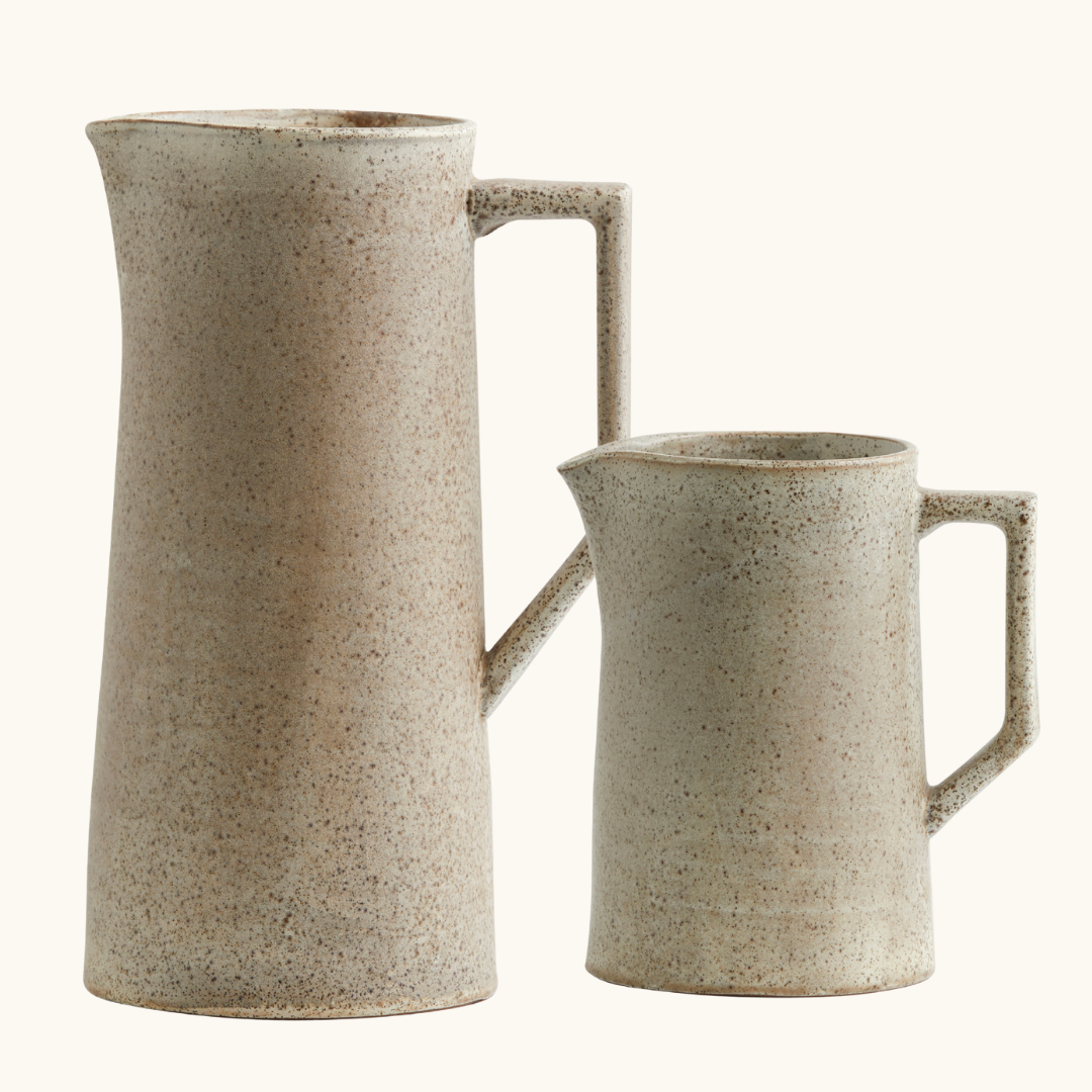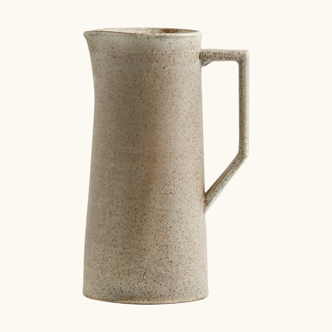 En sandfarvet stentøjskande som Venda løser et konkret problem: du vil gerne have noget på bordet, som både ser pænt ud og faktisk kan bruges til servering. Kanden er oplagt til morgenmaden, hvor du kan fylde den med juice eller vand og sætte den frem uden at tænke yderligere over borddækningen. Til aftensmaden fungerer den store model med sine 1.800 ml fint til suppe eller kolde drikke, mens den lille på 750 ml er god til saft eller mælk. Har du gæster, kan du sætte kanden frem som et enkelt og stilrent element i borddækningen, der ikke kræver noget ekstra. Den praktiske hank giver et godt greb, og tudden gør det nemt at hælde op uden spild. Venda kan desuden bruges som vase, hvis du vil give den en anderledes funktion i hjemmet — den sandfarvet farve og matte overflade passer til både blomster og grønne kviste. Kanden fungerer ligeledes godt som en del af en samlet bordopsætning, hvor du kombinerer den med tallerkener og skåle i samme jordnære farvepalette for et sammenhængende og gennemtænkt udtryk.