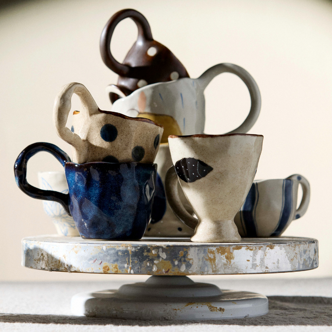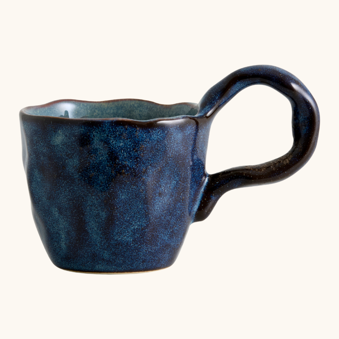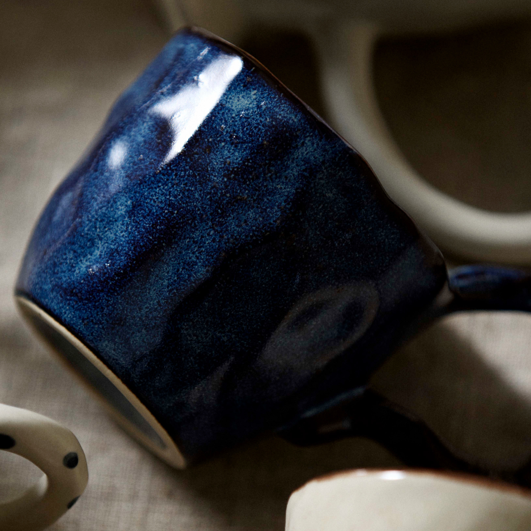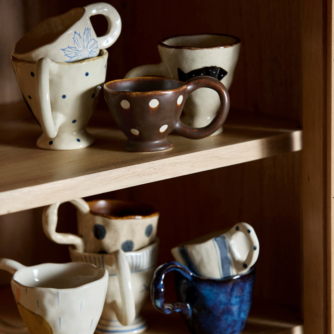En håndlavet kop med hank gør en forskel, når du sætter dig ned med din morgenkaffe eller en varm kop te om eftermiddagen. Den ujævne hank sidder godt i hånden og giver et taktilt greb, som en maskineformet kop sjældent kan matche. Zina-varianten kommer i brun og creme og er den mindste i kollektionen med en diameter på 8 cm og en højde på 6,5 cm — god til en espresso eller en lille, stærk kop kaffe. Fava er blå og lidt større med en højde på 7,5 cm og en diameter på 8,5 cm, og den passer fint til en latte eller en generøs kop te. Baya deler mål med Fava, men fås i sand, brun og blå, og de håndmalede detaljer giver hver enkelt kop sit eget udtryk. Nira er den største i serien med en højde på 10 cm og en diameter på 10 cm — den er oplagt til en stor kop kaffe eller en varm drik, når du vil sidde længe og nyde roen. Alle fire varianter rummer cirka 250 ml og er opvaskemaskineegnede, så de holder til daglig brug uden besvær. Sæt to eller tre varianter sammen på bordet, og du får en borddækning med naturlig variation og personlighed, der ikke kræver nogen ekstra indsats — farverne og formerne taler fint sammen på tværs af serien.