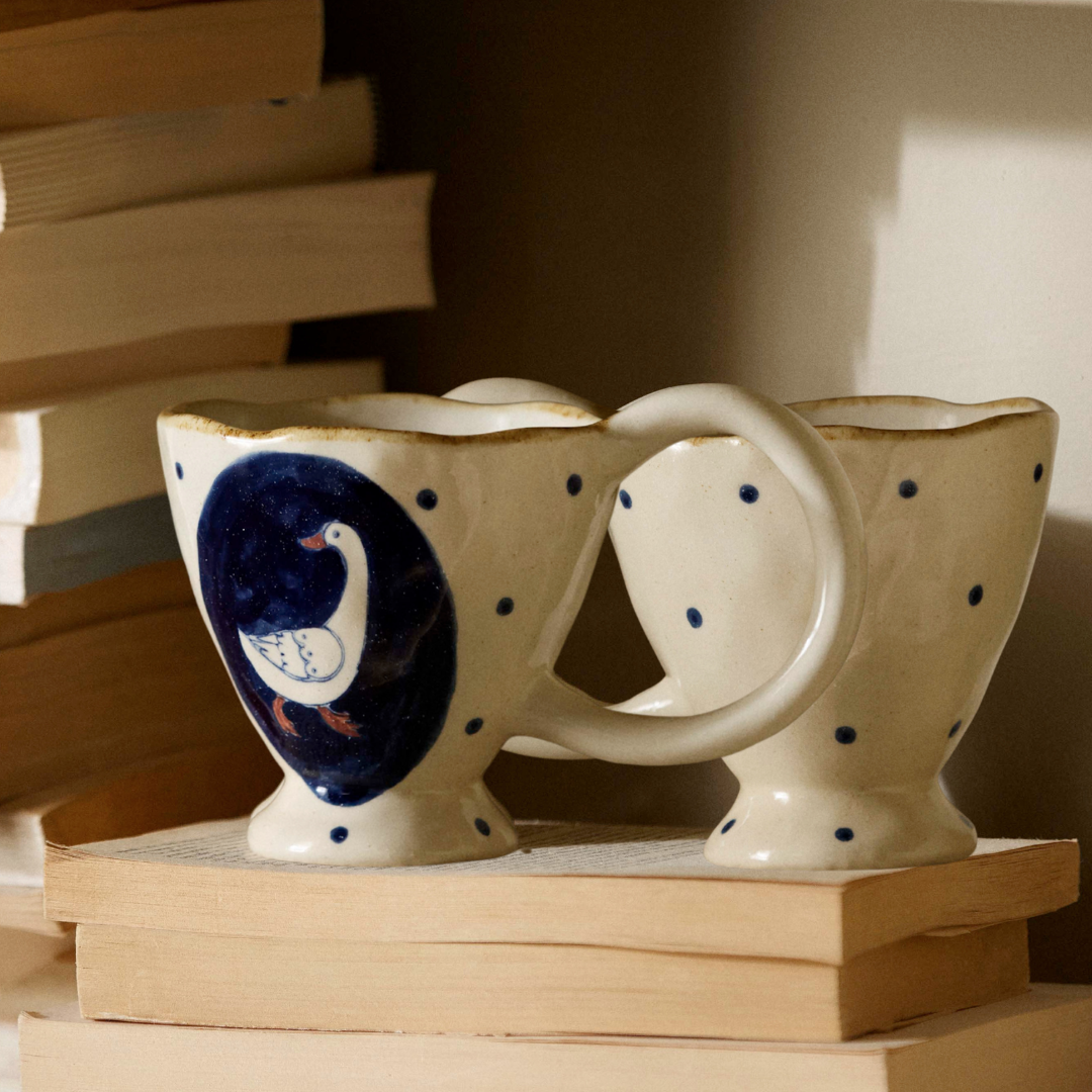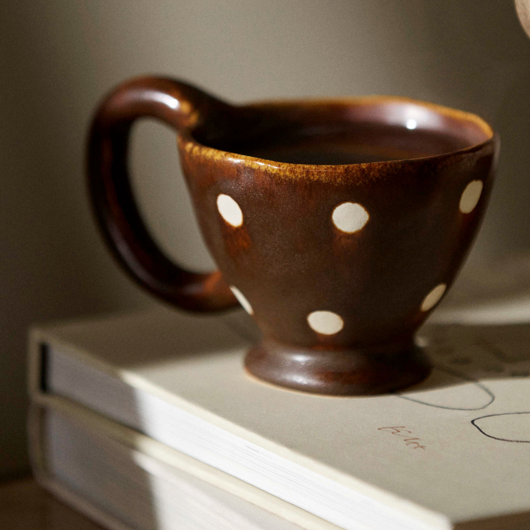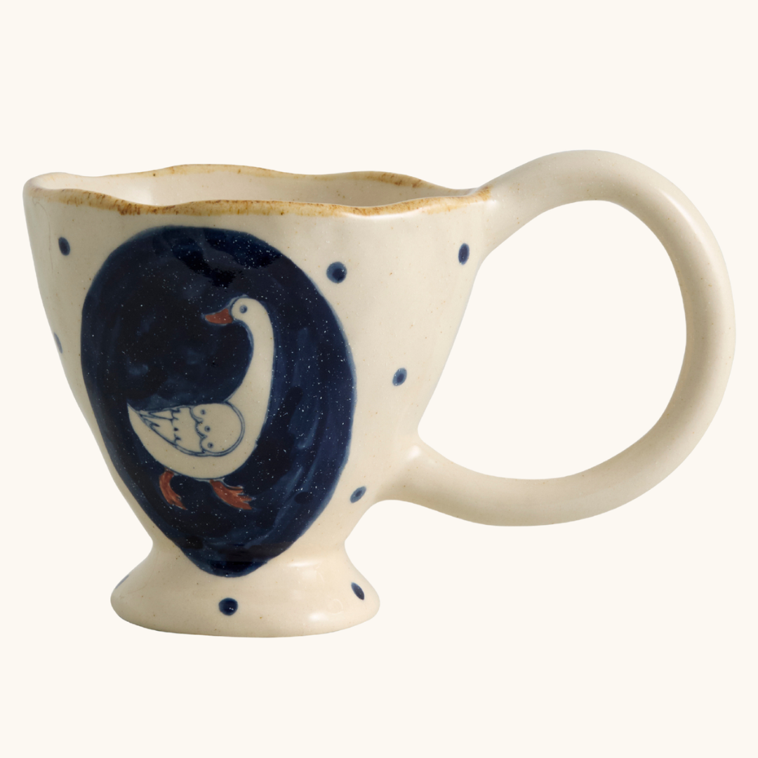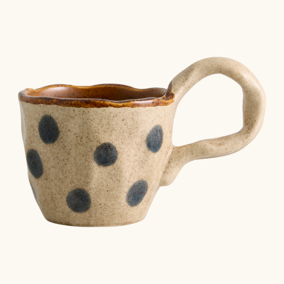En håndlavet kop med hank gør en forskel, når du sætter dig ned med din morgenkaffe eller en varm kop te om eftermiddagen. Den ujævne hank sidder godt i hånden og giver et taktilt greb, som en maskineformet kop sjældent kan matche. Zina-varianten kommer i brun og creme og er den mindste i kollektionen med en diameter på 8 cm og en højde på 6,5 cm — god til en espresso eller en lille, stærk kop kaffe. Fava er blå og lidt større med en højde på 7,5 cm og en diameter på 8,5 cm, og den passer fint til en latte eller en generøs kop te. Baya deler mål med Fava, men fås i sand, brun og blå, og de håndmalede detaljer giver hver enkelt kop sit eget udtryk. Nira er den største i serien med en højde på 10 cm og en diameter på 10 cm — den er oplagt til en stor kop kaffe eller en varm drik, når du vil sidde længe og nyde roen. Alle fire varianter rummer cirka 250 ml og er opvaskemaskineegnede, så de holder til daglig brug uden besvær. Sæt to eller tre varianter sammen på bordet, og du får en borddækning med naturlig variation og personlighed, der ikke kræver nogen ekstra indsats — farverne og formerne taler fint sammen på tværs af serien.