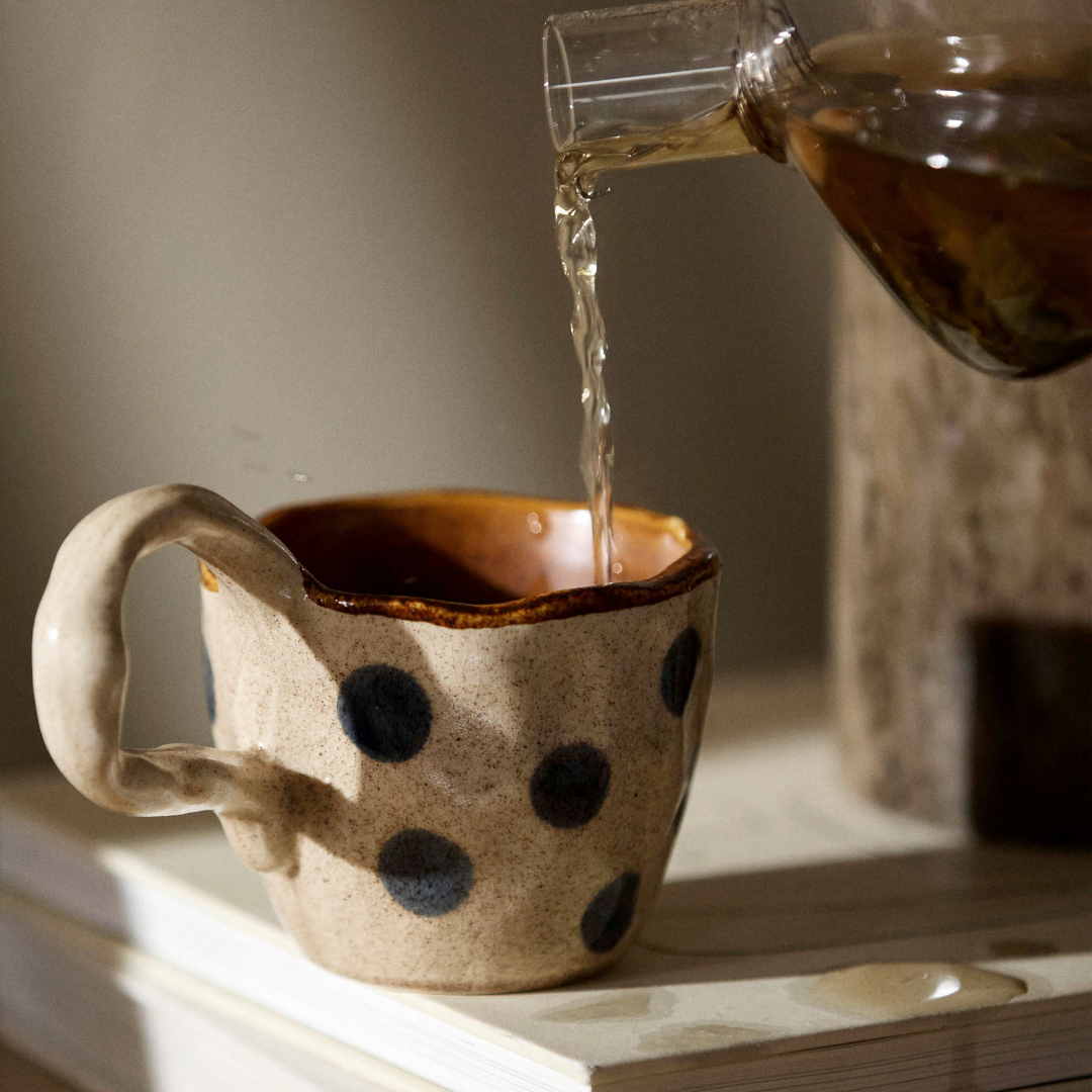 Kopperne i Atelier Forma-kollektionen er lavet i stentøj, som er et robust og tæt keramikmateriale, der egner sig godt til dagligdags brug og holder til mange år i køkkenet. Overfladen er håndformet, og det betyder, at glasuren fordeler sig organisk og fanger lyset på en måde, som giver et levende udtryk fra alle vinkler. De håndmalede detaljer varierer fra kop til kop — bølgende penselstrøg, bløde mønstre og farver, som er lagt på i hånden uden skabeloner eller maskiner. Det er præcis den slags variation, som gør en keramisk kop med hank til et stykke håndværk frem for et masseproduceret produkt. Stentøjet er fødevaregodkendt og tåler opvaskemaskine, så du kan bruge dem dagligt uden at bekymre dig om vedligeholdelse eller særlig behandling. Hanken er formet med samme organiske tilgang som resten af koppen og sidder fast og trygt, selv når koppen er fyldt. Det er en kop med hank, som er lavet til at blive brugt — igen og igen, dag efter dag.