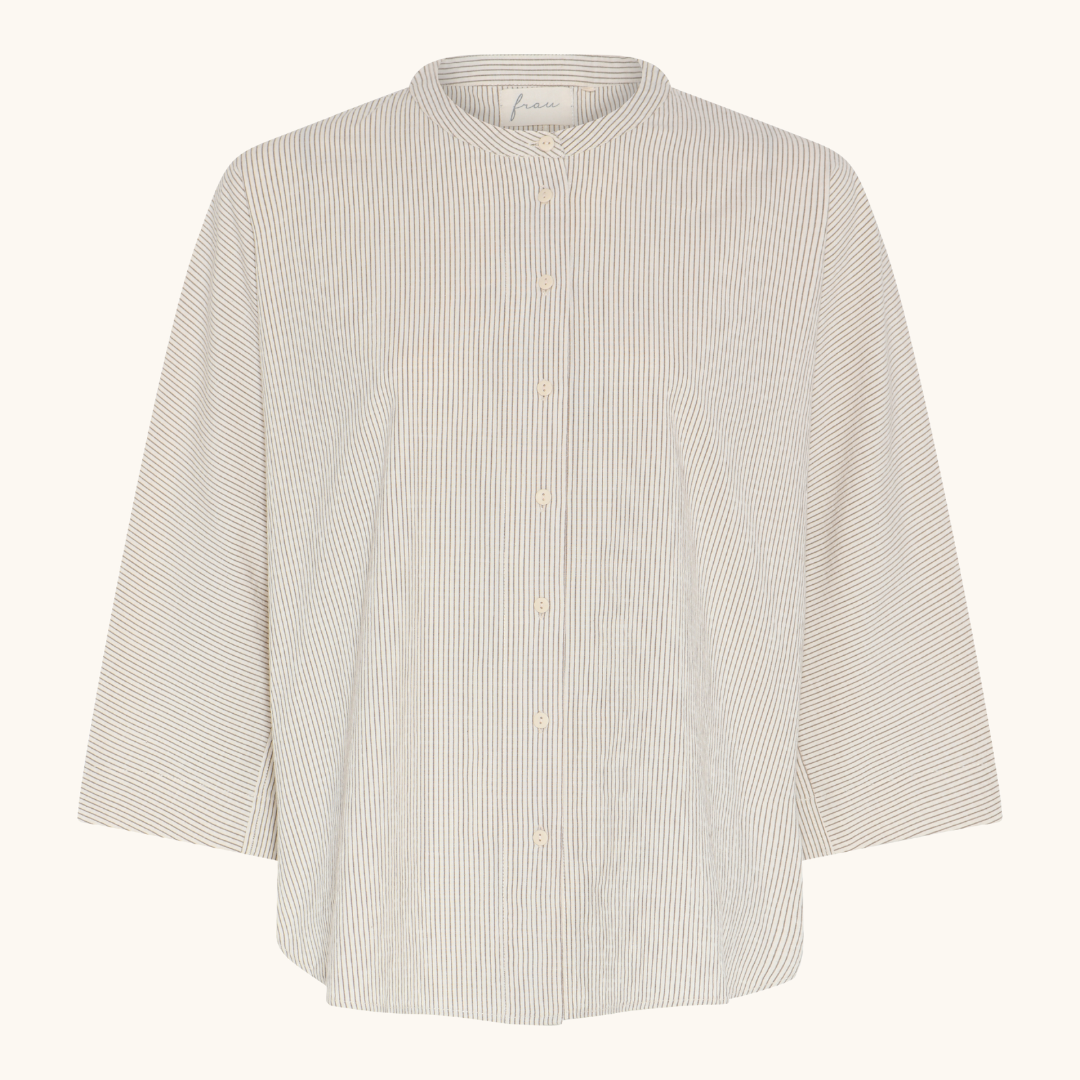Seoul skjorten fra Frau har fine brune striber på en lys beige bund med en varm gul undertone. Skjorten har kinakrave, knapper foran og 3/4-ærmer.