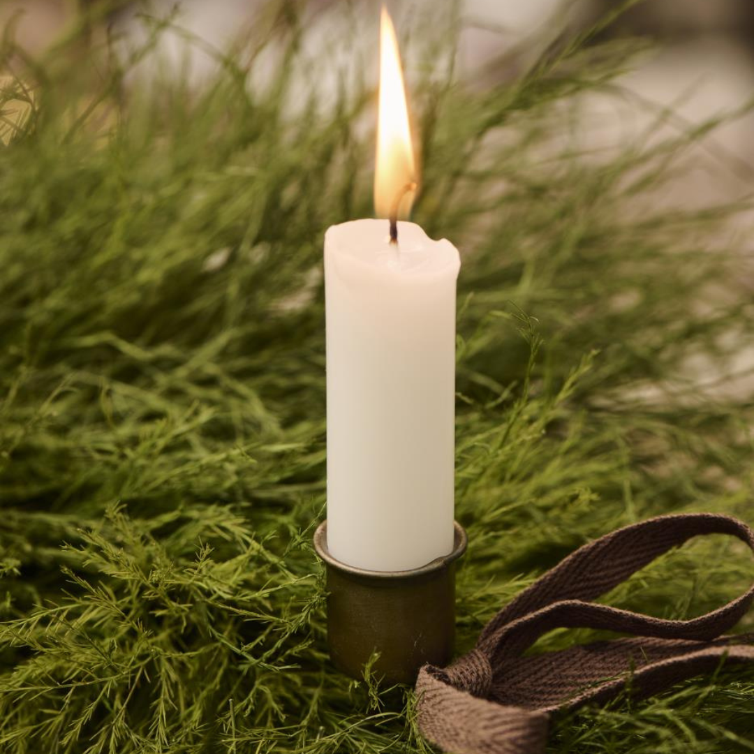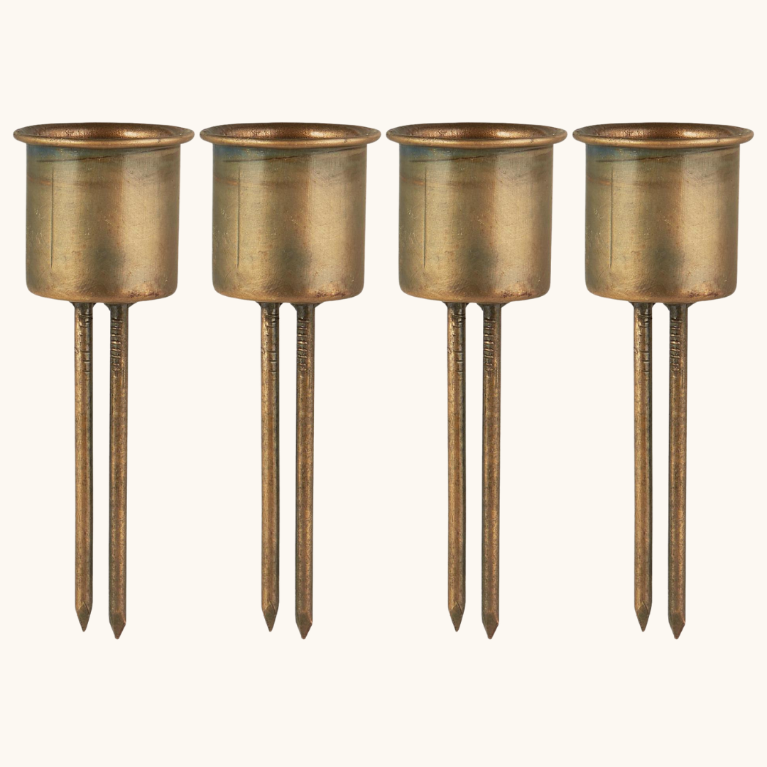Med disse lysspyd i metal får du en nem og sikker løsning til at sætte lys fast i adventskransen eller andre juledekorationer. Holderen har dobbelt spyd, der stikkes ned i dekorationen, så lyset står stabilt. De passer til almindelige lys på Ø 2,2 cm og er håndlavede i en gylden finish, som tilføjer varme til dine julearrangementer.