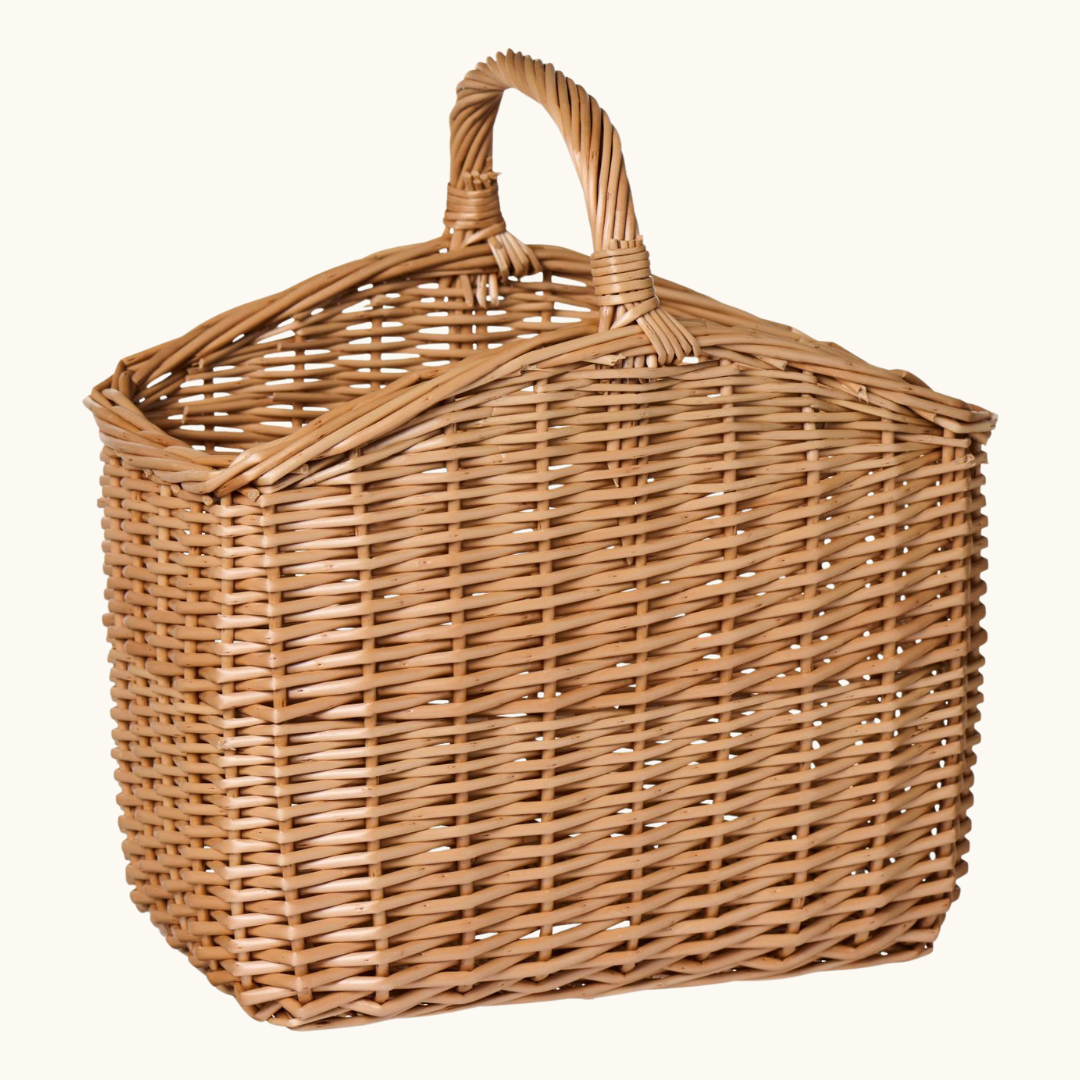 Den er håndflettet i naturpil og har en tværgående hank, som giver den et klassisk og naturligt udtryk.