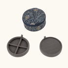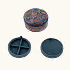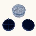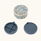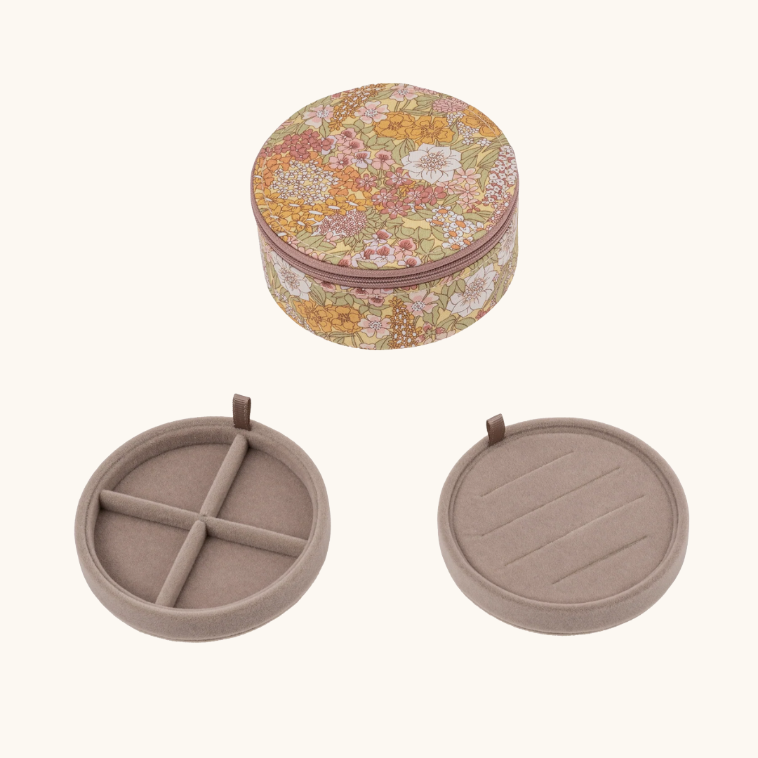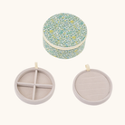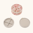 Det runde smykkeskrin er betrukket med et charmerende Liberty-blomsterprint og har et blødt fór indvendigt. Det indvendige fór har en farve, som passer smukt til smykkeskrinets ydre. Med to lag og små rum er det perfekt til opbevaring af ringe, øreringe og andre små smykker.