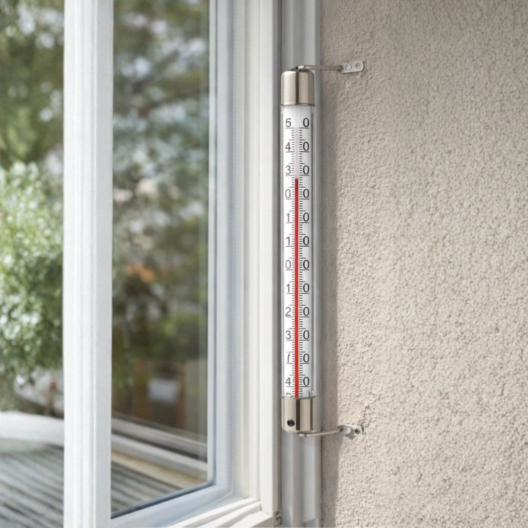 Skalaen går fra -50 til +50 °C og kan nemt aflæse gennem ruden. Den kompakte størrelse på 21 cm gør det diskret på vinduesrammen og passer til de fleste vinduer. Metalbeslaget i stål holder termometeret sikkert på plads.