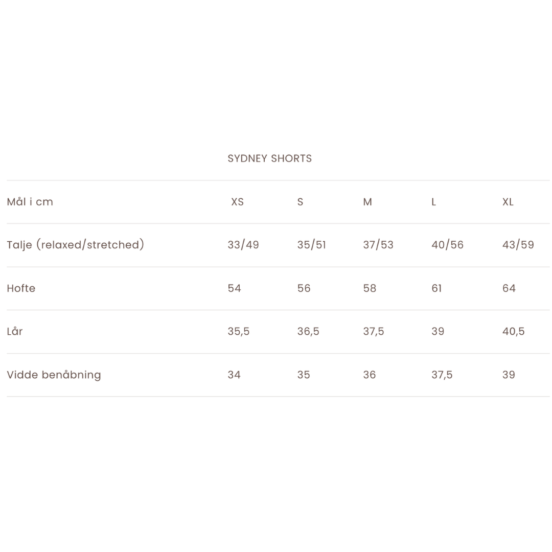 Sydney shortsene findes i fem størrelser, XS, S, M, L, XL.