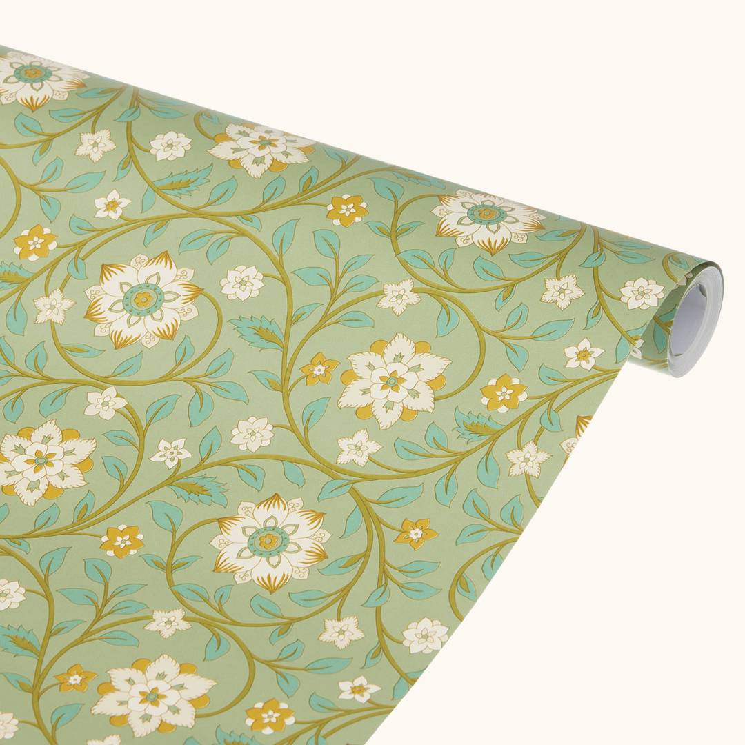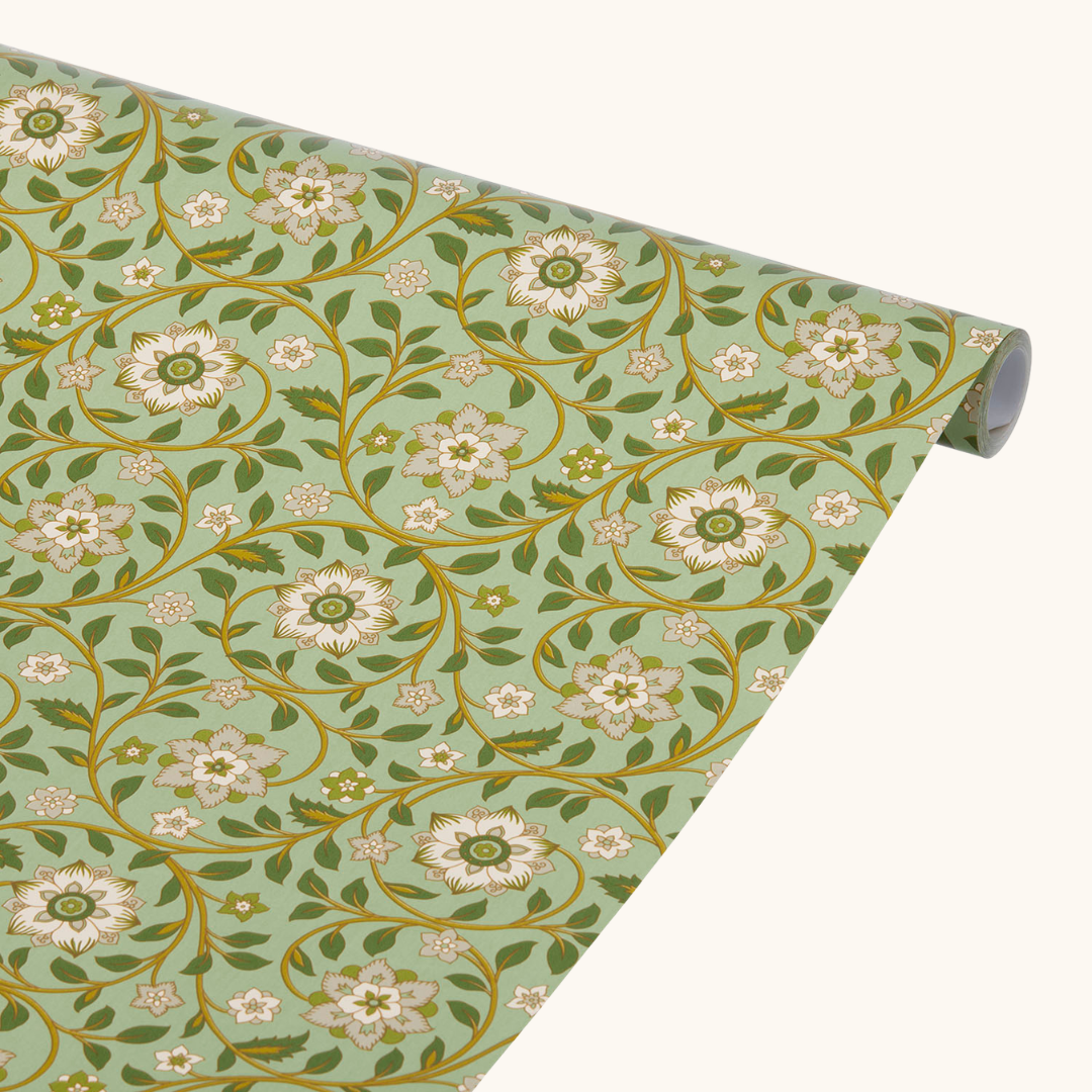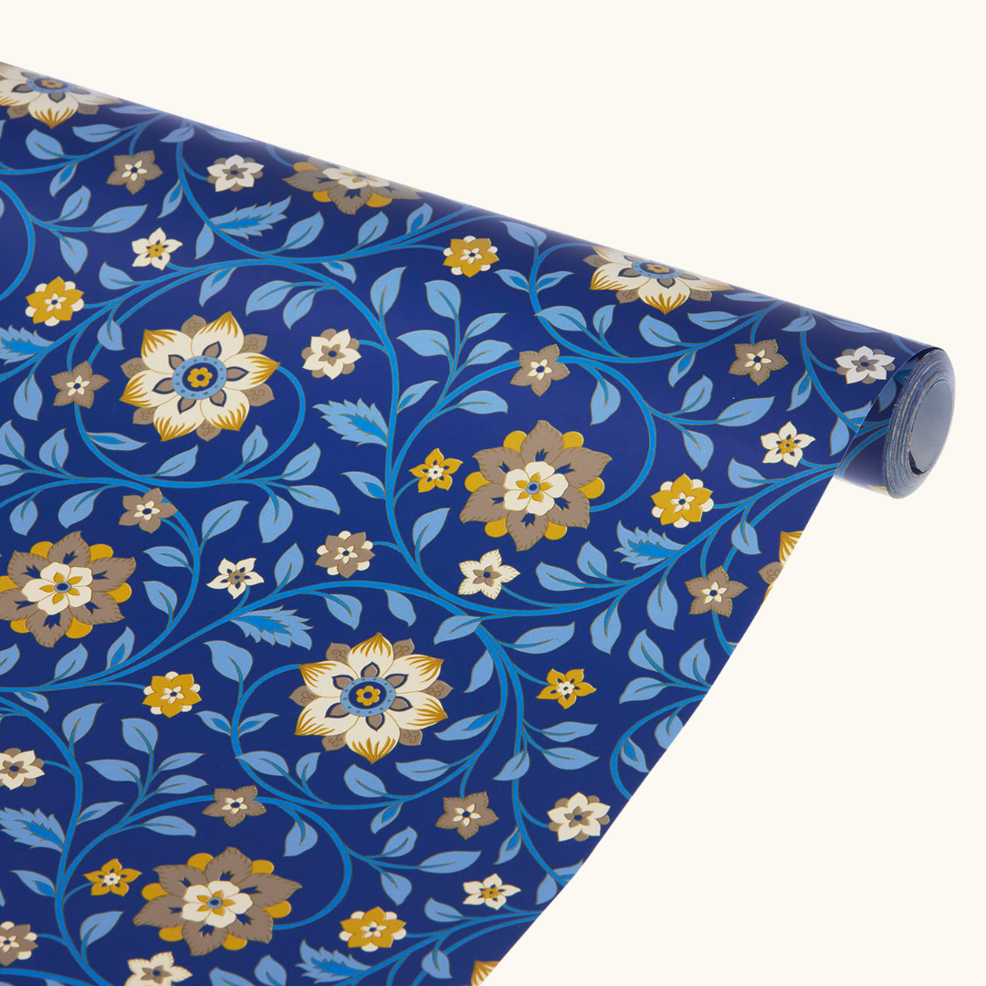 Indpakningspapiret Roja fra Bungalow er trykt med et tæt, botanisk blomsterprint med slyngede ranker, blade og store blomster i varme, mættede farver. Det semi-matte papir giver et roligt, fint udtryk og er tykt nok til at folde rent og skarpt.