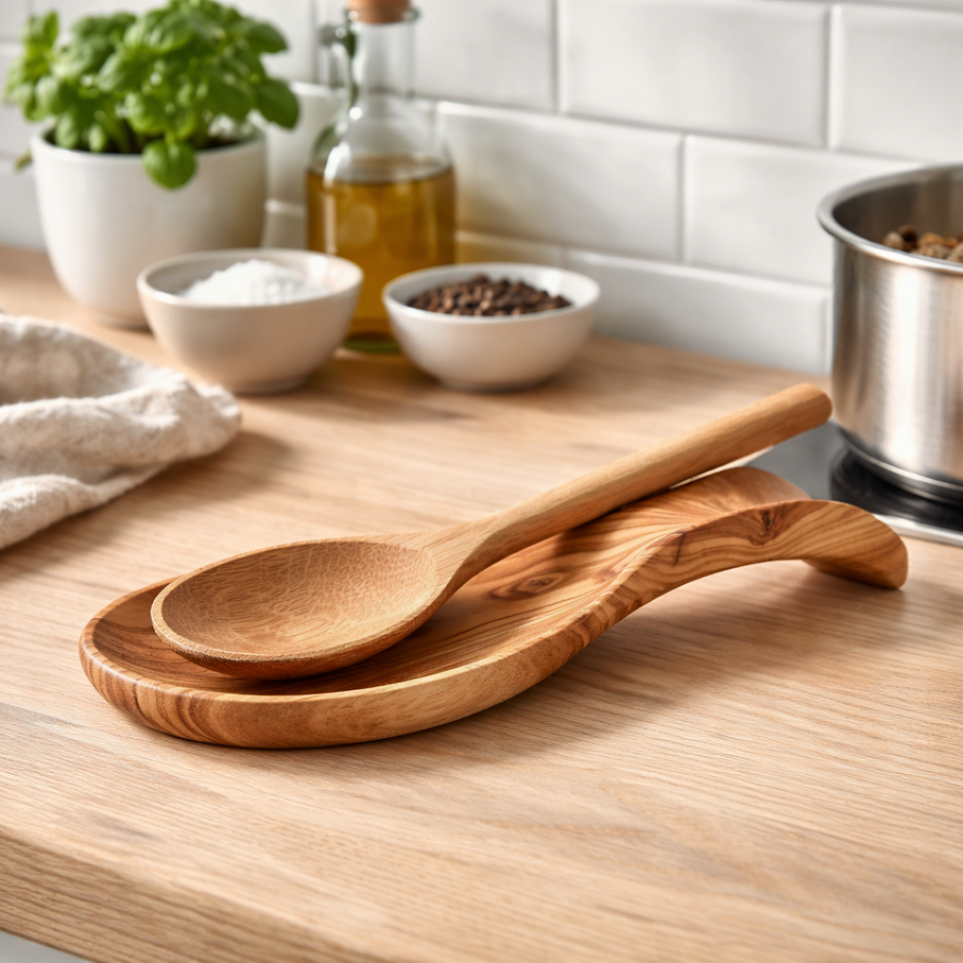 Den smukke skeholder i oliventræ, holder køkkenbordet rent under madlavningen.