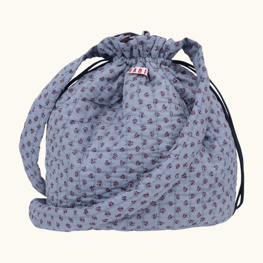 Snorposen fra Habiba er syet i det samme blomsterprint som resten af Astrid serien – små mørkerøde blomster på en blå bund med fine quiltesting. Den er blød, let og nem at pakke ned, og det lange håndtag på 109 cm gør den nem at bære over skulderen.