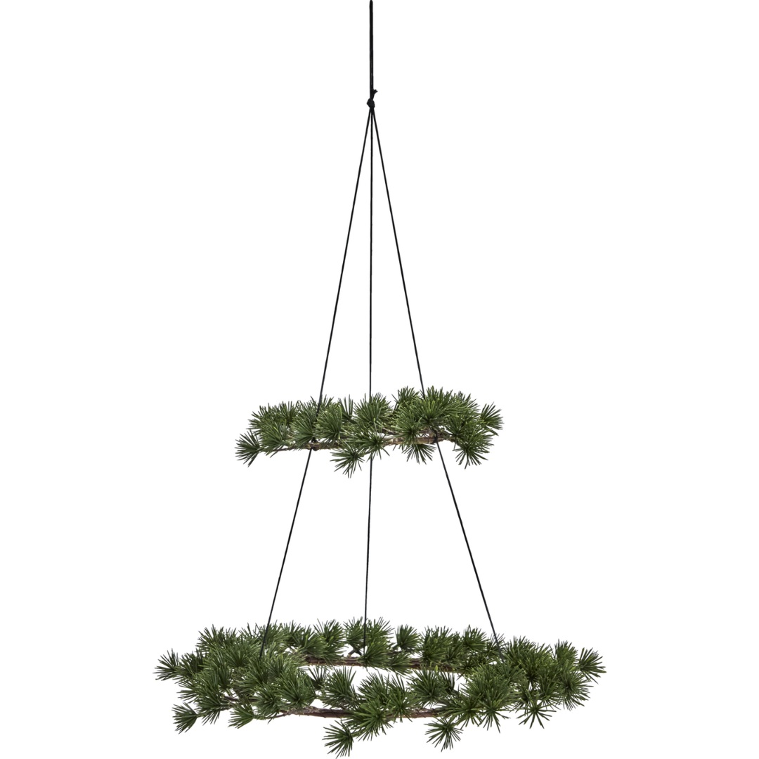 Ringen består af to lag med kunstgran i et realistisk udtryk, som giver et smukt og levende look. Snorene i kransen er i jute.