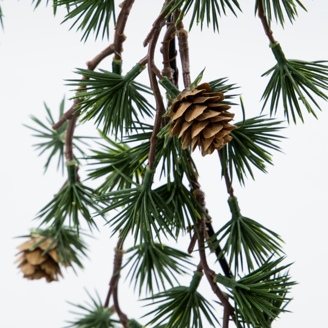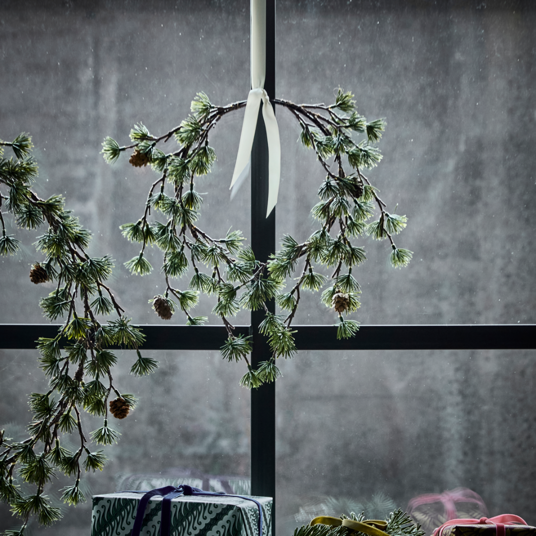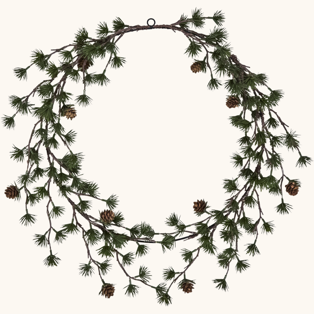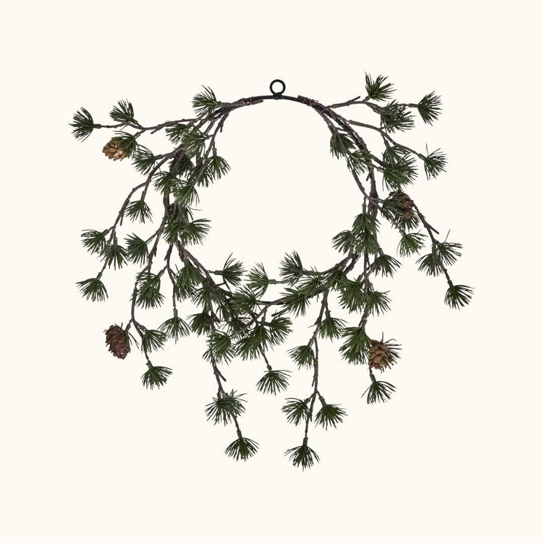Kransen er lavet af kunstgran med små kogler og har et naturtro udtryk, som passer perfekt til både dør, vindue eller som dekoration på væggen.