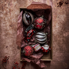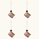 Sættet består af fire håndlavede glasophæng i rød, hvid og guld – inspireret af traditionelle juletrommer.