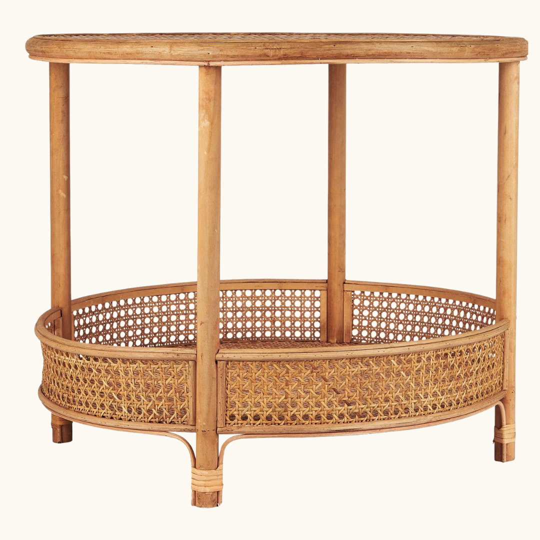 Rundt rattanbord med hylde – naturligt og dekorativt.