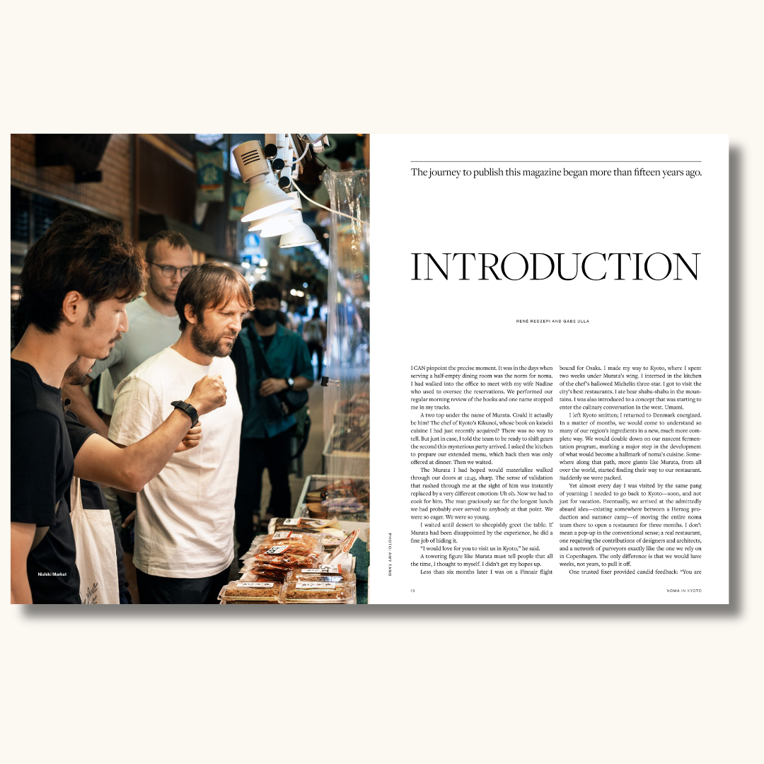 Rejsen begyndte, da Redzepi blev inviteret til Japan af den tre Michelin-stjernede kok Murata-san. Et to ugers lynkursus blev startskuddet på en kærlighed til Japan, som siden har formet Noma på afgørende måder. I dag tæller teamet otte japanske medlemmer, og forbindelsen til landet strækker sig fra kunsthåndværkere og landmænd til sankere og kokkekolleger spredt over hele Japan. Denne coffee table book om Noma samler alle de tråde og viser, hvad tre års forberedelse, udforskning og nysgerrighed kan føre til.