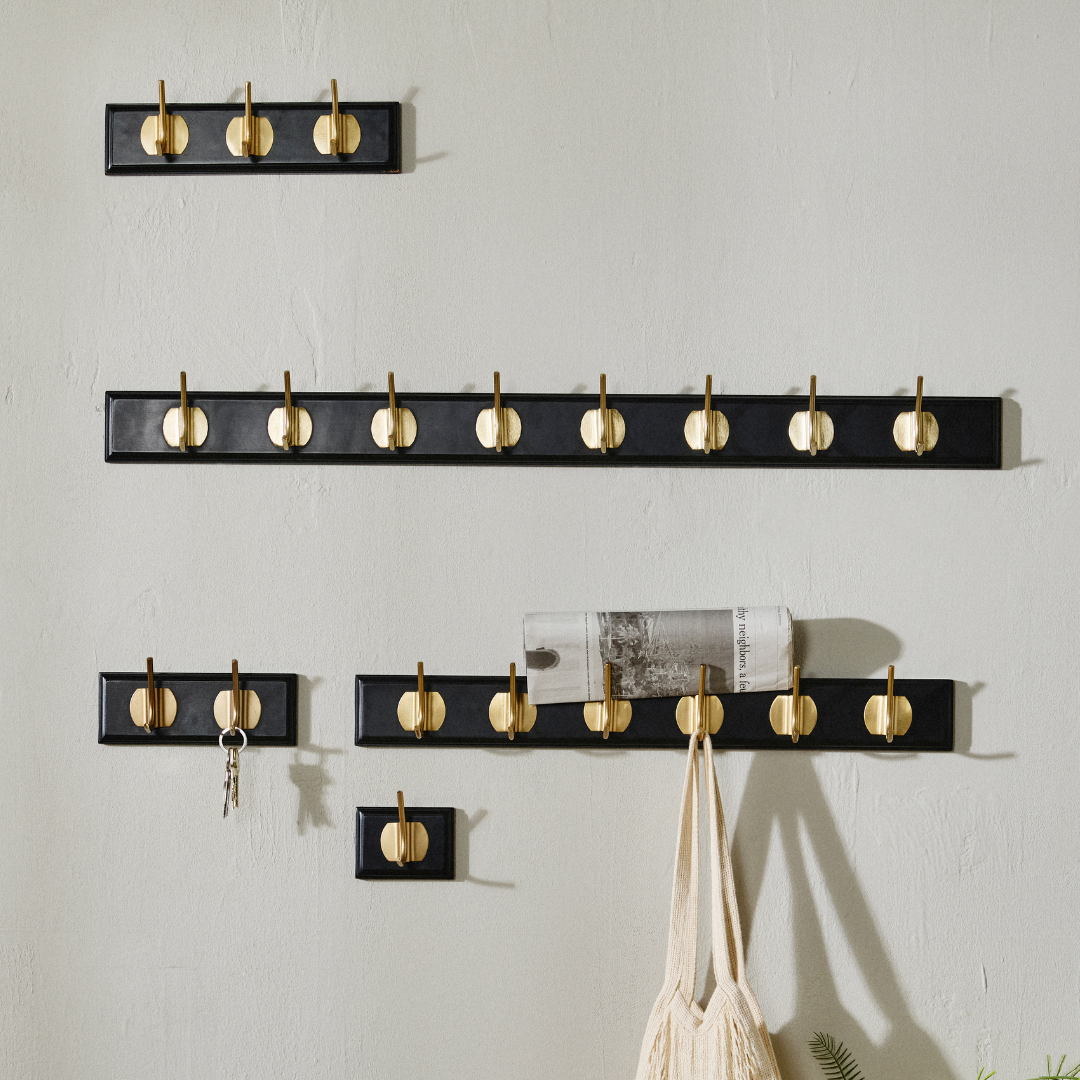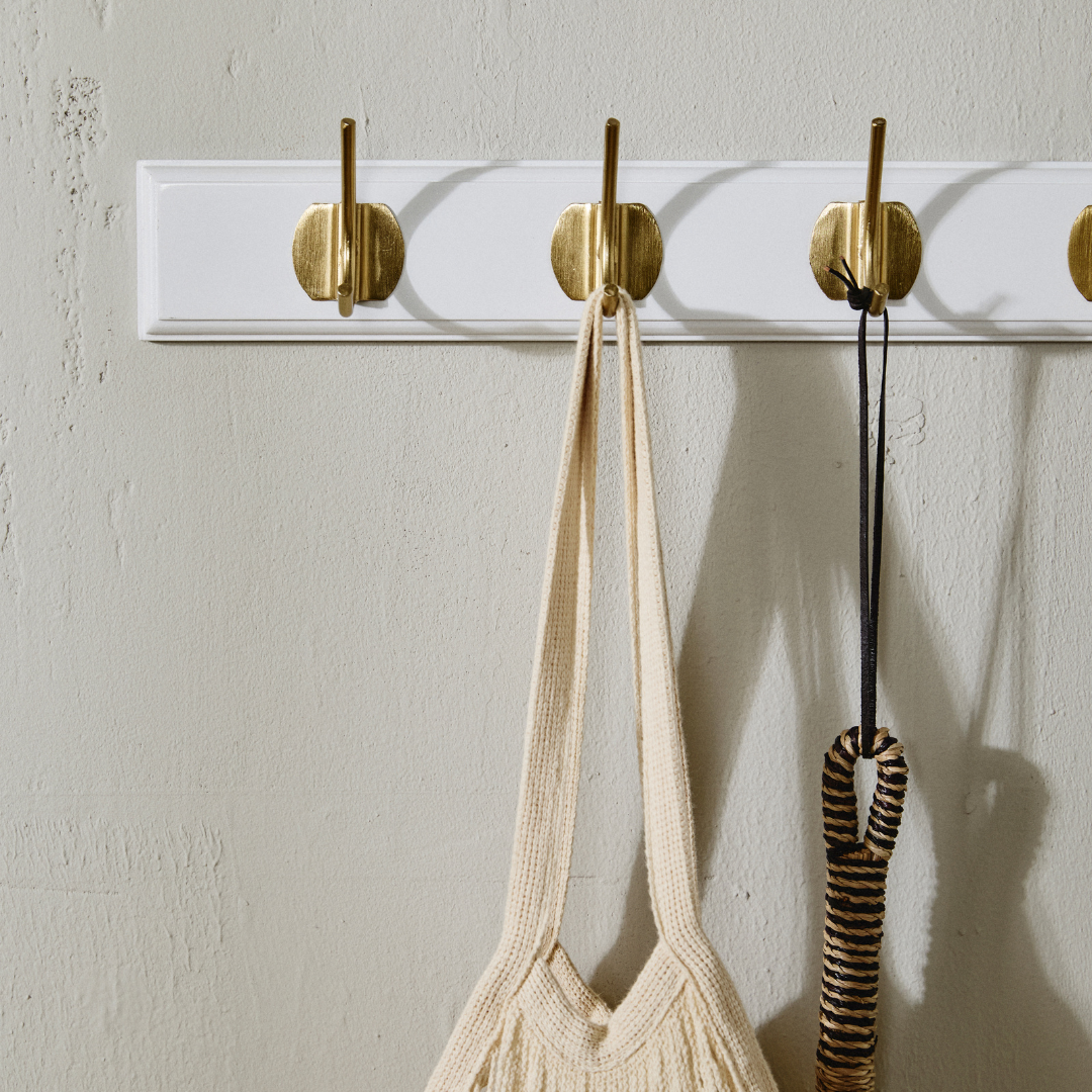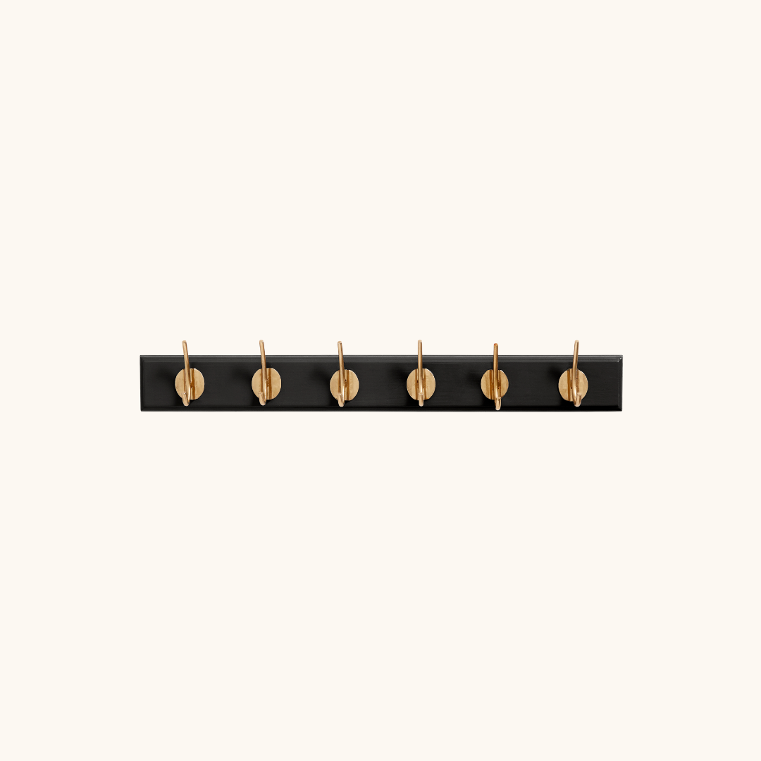 En knagerække i træ med messingknager løser et konkret problem: hvor skal jakken, tasken eller hundesnoren egentlig hænge? EDGY giver dig et fast sted til de ting, som ellers ender på stolen eller gulvet. I entréen holder den overblikket fra det øjeblik, du træder ind ad døren – og den sørger for, at morgenrutinen bliver lidt nemmere, når alt hænger på sin plads. Vælger du varianten med seks knager på 60 cm, er der plads til hele familiens overtøj på en enkelt, ryddelig række. Har du et lille badeværelse eller soveværelse, passer varianten med én eller to knager perfekt til håndklæder, tasker eller smykker. I soveværelset kan den bruges til morgenkåben, det næste dags tøj eller et par halskæder, der ellers forsvinder i en skuffe. Varianten med tre knager og en længde på 30 cm er en kompakt knagerække til entre-væggen, som ikke fylder mere end nødvendigt, men stadig giver plads til det vigtigste. Den store variant med otte knager på 90 cm er oplagt i gangen, på kontoret eller i et bryggers, hvor der er brug for plads til mange ting på én gang. Knagerne i messing til væg tilfører et varmt, metallisk udtryk, som løfter den hvide eller sorte bagplade uden at overdøve rummets øvrige indretning. Inkluderede skruer gør monteringen nem, og du er hurtigt klar til brug.