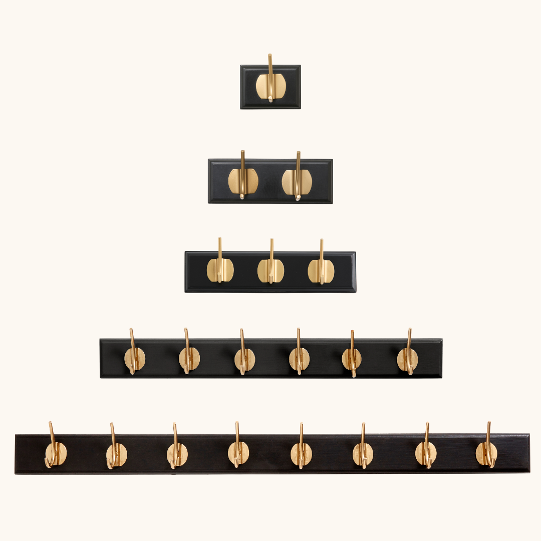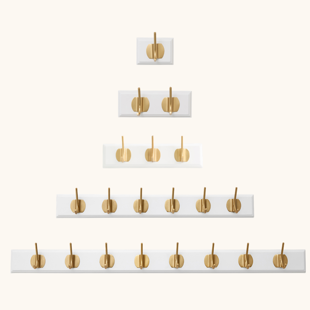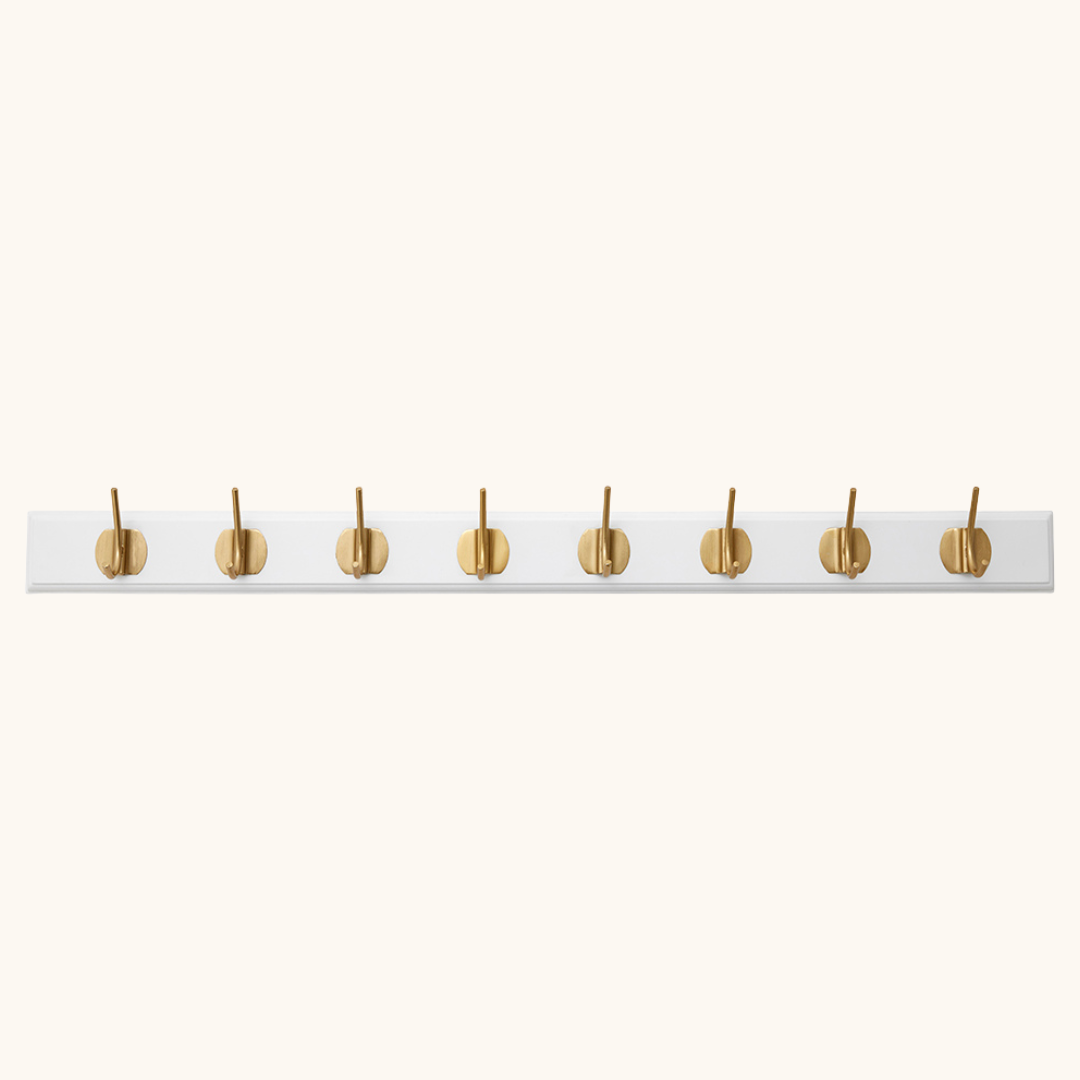 En knagerække i træ med messingknager løser et konkret problem: hvor skal jakken, tasken eller hundesnoren egentlig hænge? EDGY giver dig et fast sted til de ting, som ellers ender på stolen eller gulvet. I entréen holder den overblikket fra det øjeblik, du træder ind ad døren – og den sørger for, at morgenrutinen bliver lidt nemmere, når alt hænger på sin plads. Vælger du varianten med seks knager på 60 cm, er der plads til hele familiens overtøj på en enkelt, ryddelig række. Har du et lille badeværelse eller soveværelse, passer varianten med én eller to knager perfekt til håndklæder, tasker eller smykker. I soveværelset kan den bruges til morgenkåben, det næste dags tøj eller et par halskæder, der ellers forsvinder i en skuffe. Varianten med tre knager og en længde på 30 cm er en kompakt knagerække til entre-væggen, som ikke fylder mere end nødvendigt, men stadig giver plads til det vigtigste. Den store variant med otte knager på 90 cm er oplagt i gangen, på kontoret eller i et bryggers, hvor der er brug for plads til mange ting på én gang. Knagerne i messing til væg tilfører et varmt, metallisk udtryk, som løfter den hvide eller sorte bagplade uden at overdøve rummets øvrige indretning. Inkluderede skruer gør monteringen nem, og du er hurtigt klar til brug.
