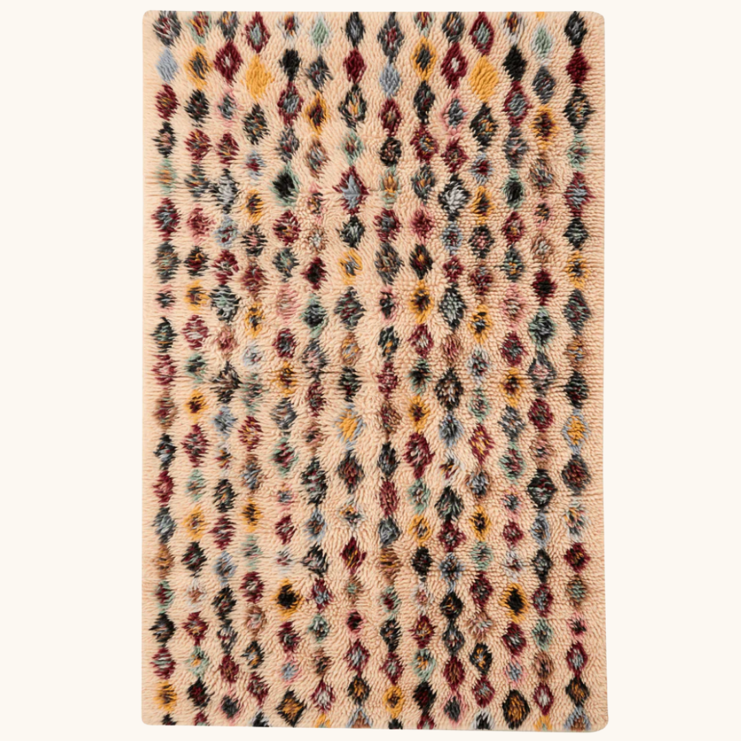 Tæppe i uld til stuen – Poppy 200x140 cm med farverigt mønster
