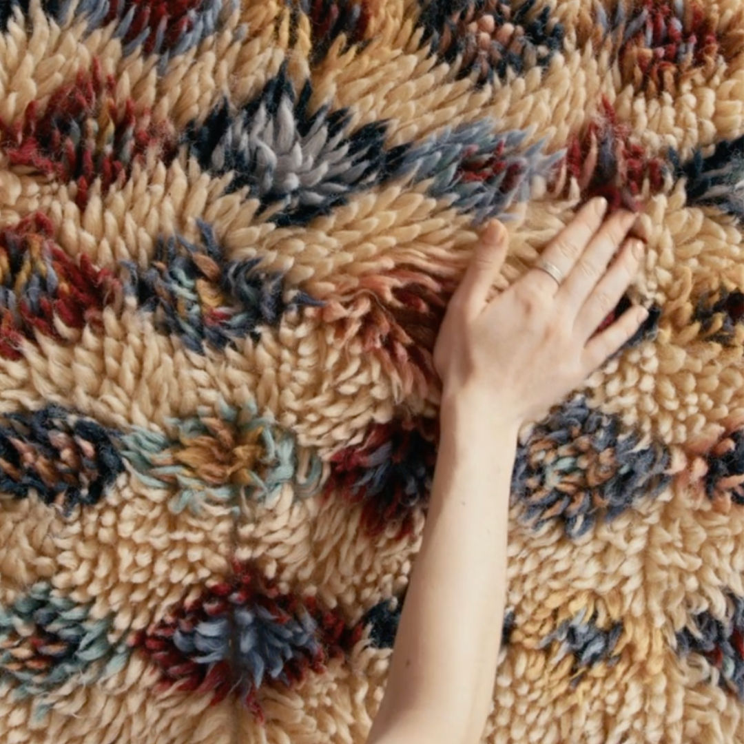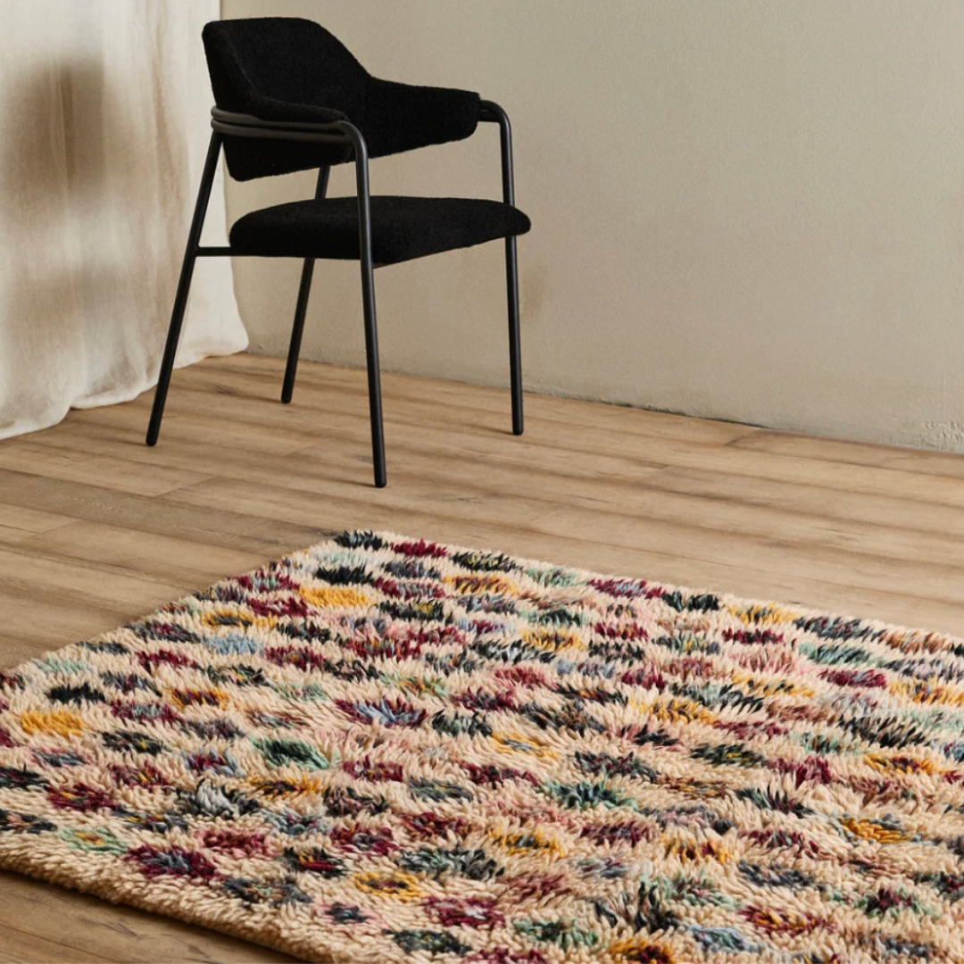 Poppy er vævet i en blanding af 85 % uld og 15 % bomuld. Ulden giver tæppet sin karakteristiske bløde overflade og naturlige varme, mens bomulden bidrager til strukturen og holdbarheden over tid. Kombinationen af de to materialer resulterer i et tæppe med en taktil kvalitet, som mærkes tydeligt under foden. Fordi det er lavet af uld, kan det afgive løse fibre, særligt i starten — det er en naturlig egenskab ved ulden og ikke et tegn på dårlig kvalitet. Regelmæssig støvsugning fjerner overskydende fibre og holder tæppet pænt i mange år fremover. Det grafiske mønster i mange farver er vævet direkte ind i materialet og sidder fast i konstruktionen, så farverne bevarer deres udtryk selv efter længere tids brug. Tæppet er håndlavet i Indien, og da det er produceret for hånd, kan størrelsen variere med tre til fire procent fra angivne mål — det er en naturlig del af den håndværksmæssige proces. Højden på 1,5 cm giver en god balance mellem komfort og praktisk brug under møbler.