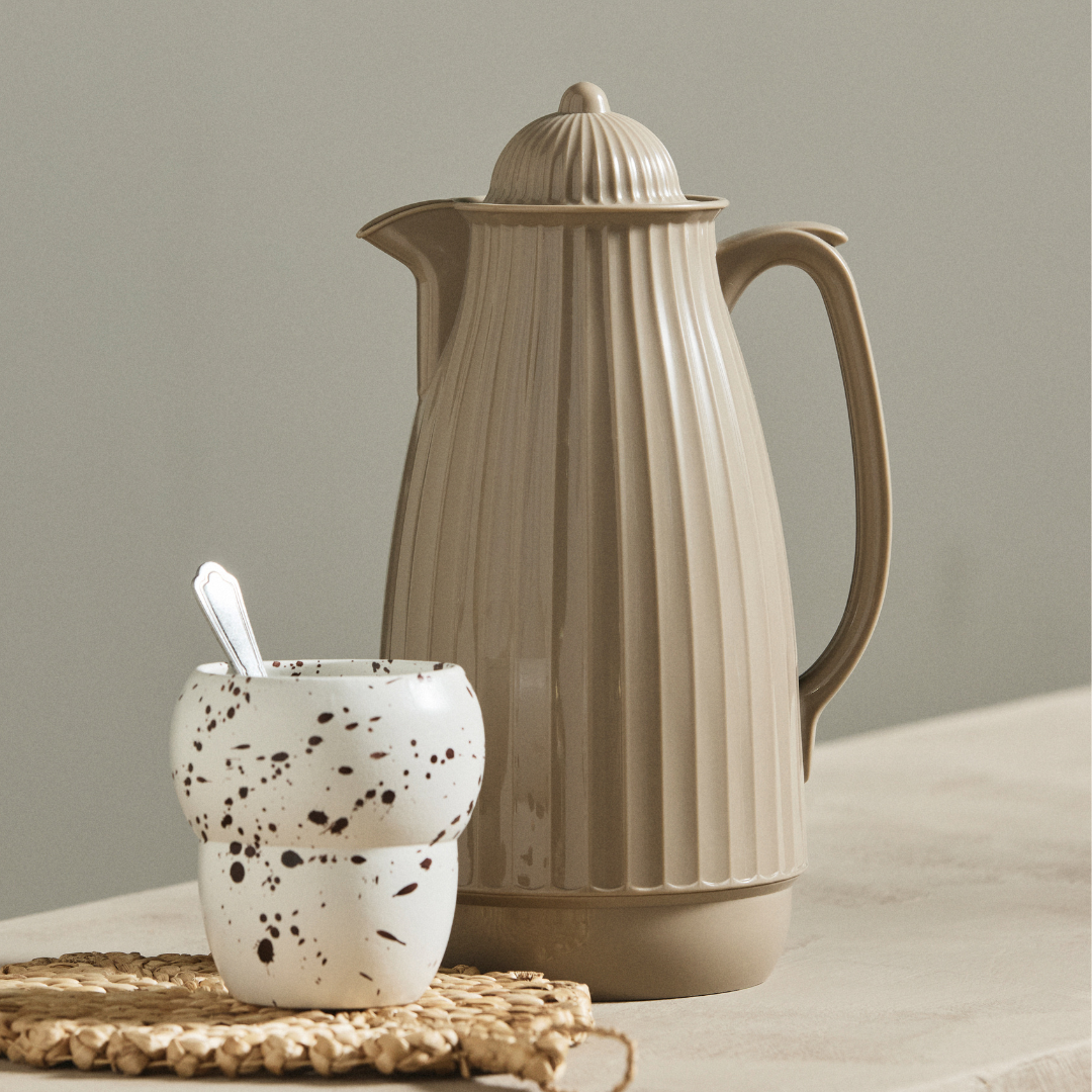 En termokande på 1 liter er den ideelle størrelse, når du vil servere kaffe eller te til to til fire personer uden at skulle op og hente mere. Carvi er oplagt til morgenmadsbordet, hvor den holder kaffen varm, mens alle finder plads og morgenen langsomt folder sig ud. Er du typen, der nyder en ekstra kop, mens avisen læses eller dagen planlægges, er det en fordel at have en kande stående, som stadig er varm en time eller to efter, den blev brygget. Til et møde hjemme i stuen er det praktisk at have en kaffetermokande stående fremme, så alle kan hælde op selv i eget tempo. Vil du servere te til gæster, kan du brygge en hel liter og sætte kanden på bordet, så tekanden ikke behøver at stå og trække videre. Den lave vægt gør den let at løfte og hælde fra, og det ribbede greb sidder godt i hånden, selv når kanden er fyldt til randen. Kapaciteten på 1 liter gør den til en fleksibel hverdagskande, som dækker behovet fra den første kop om morgenen til den afsluttende kop efter aftensmaden. Kanden kan stå fremme på køkkenbordet eller bordet i stuen uden at virke malplaceret, da formen er enkel og tilpas diskret i sit udtryk. Den fungerer ligeså fint til en hyggelig brunch med venner som til en stille søndag morgen derhjemme.