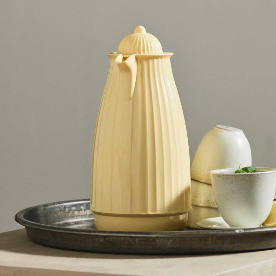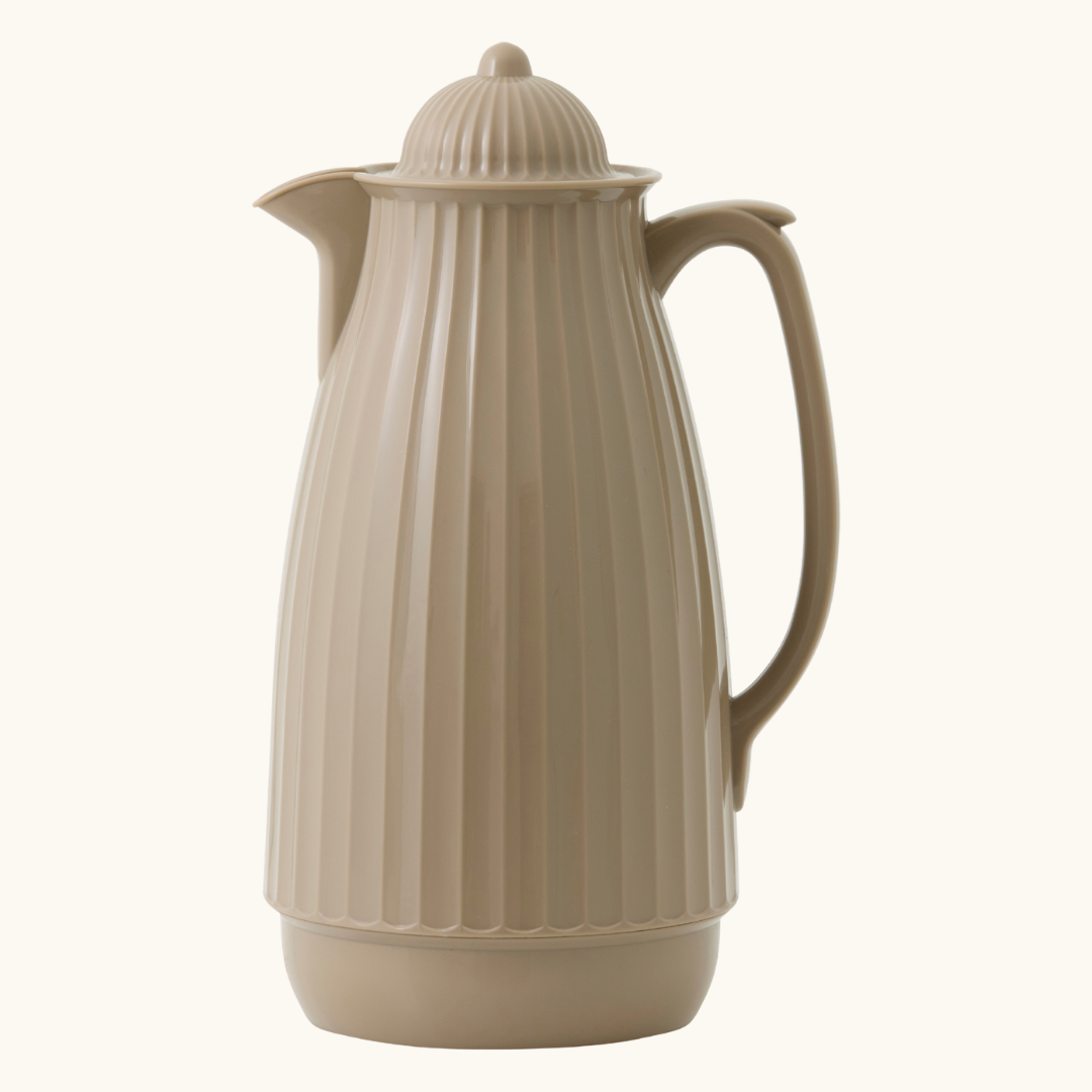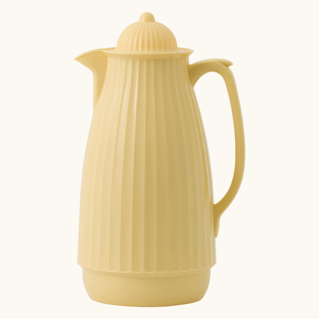 Carvi er fremstillet i PP og glas, som er to materialer, der arbejder godt sammen i en termokande. Glasset på indersiden er med til at holde på varmen og sikrer, at smagen af kaffe eller te ikke påvirkes af kanden selv. Det betyder, at du får drikkevarens rene smag i koppen, uden at der er bismag fra materialet. Ydersiden i PP er let at holde fast i og giver kanden den karakteristiske ribbede overflade, som løber synligt i hele højden og giver kanden dens særlige karakter. Kanden er 29 cm høj og har en diameter på 13 cm, hvilket giver en slank og håndterbar form, der er nem at placere på selv et travlt bord. Den er fødevaregodkendt, så du trygt kan bruge den til alle varme drikke. Håndvask anbefales for at bevare materialerne bedst muligt over tid. Den kommer i fire farver – gul, rosa, lys grøn og beige – og alle fire er dæmpede, venlige nuancer, som passer til mange slags indretninger. Uanset hvilken farve du vælger, er formen og funktionen den samme: en termokande til 1 liter, som gør det nemt at servere varme drikke uden at skulle op og koge mere vand.