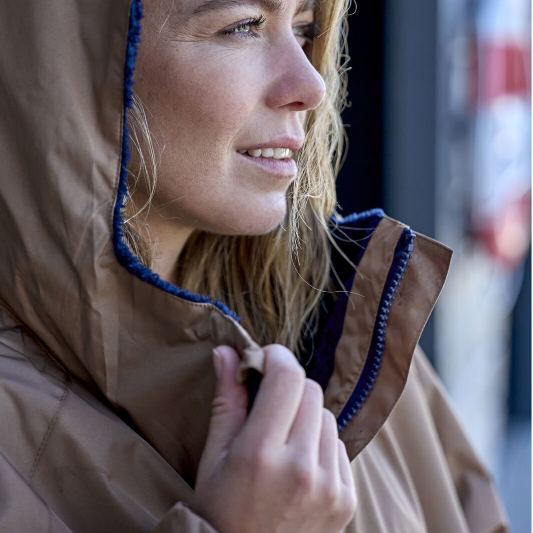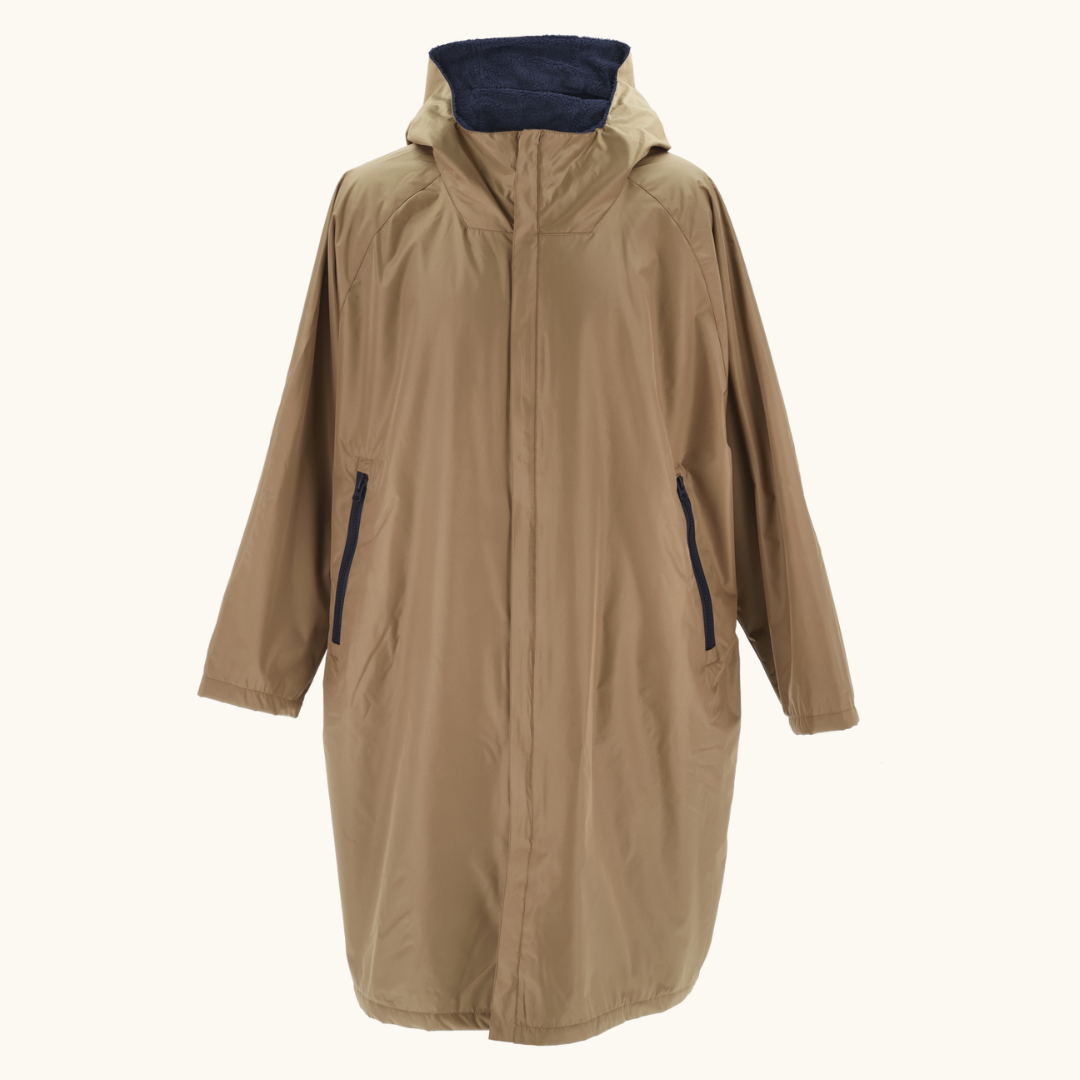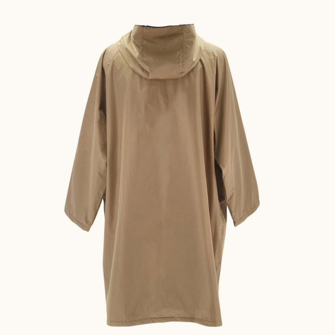 Det vindtætte og vandafvisende ydermateriale beskytter mod let vind og fugt, mens det bløde fleecefor føles rart og lunt mod huden. Den rummelige pasform gør det nemt at tage kåben over badetøj eller let overtøj, og den forede hætte og de justerbare manchetter giver ekstra komfort.